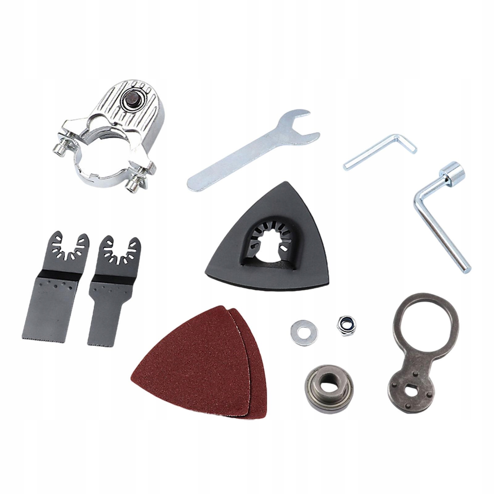[Комплексный пакет включает]: 1 треугольный шлифовальный диск (90 мм/3,54 дюйма), 2 треугольные шлифовальные бумаги (90 мм/3,54 дюйма), 2 прямых пильных полотна (20 мм/0,79 дюйма, 34 мм/ 1,34 дюйма), 1 преобразующая головка (88x86x45 мм/3,46 дюйма) x3,39x1,77 дюйма), 2 винтовых уплотнения, 1 эксцентриковый вал, 1 фиксированная пластина, 2 головки для ключей и 1 шестигранный ключ.