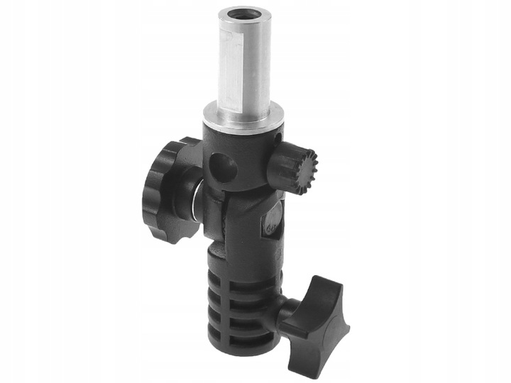 Адаптер имеет крепление для штатива с замком в основании, поэтому его можно установить практически на любую осветительную стойку со студийным наконечником 16 мм. В верхней части адаптера имеется студийный наконечник 16 мм. Кроме того, на него можно установить зонтик, а ручка-фиксатор предотвращает его выскальзывание. Адаптер можно наклонять в диапазоне 0-180 градусов.