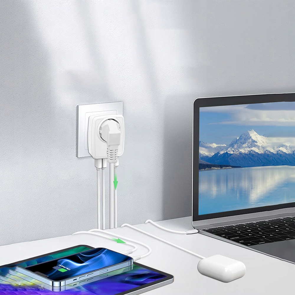 - 1 розетка европейского стандарта + 1 порт USB Type-C + 3 порта USB для одновременной зарядки 5 устройств на высокой скорости. Интерфейс USB-A/USB-C может достигать тока до 3 А.