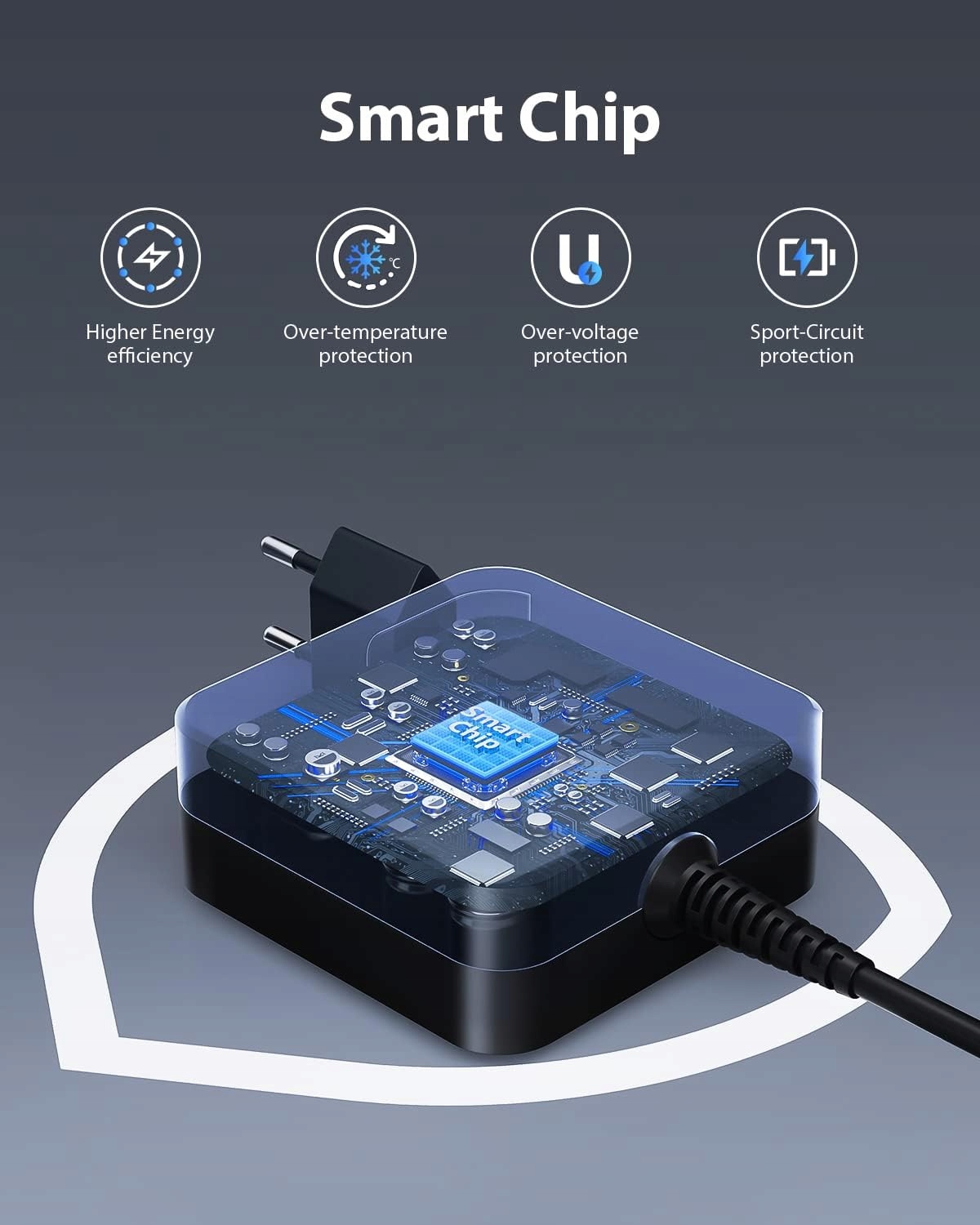 Благодаря более интеллектуальному микросхеме мощностью 65 Вт он идеально подходит для быстрой зарядки большинства устройств типа C, например ноутбук, планшет, наушники, смартфоны, Nintendo Switch и многие другие
