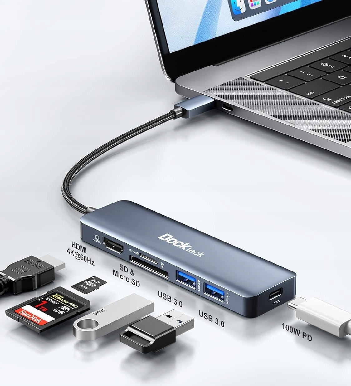 Многопортовый адаптер USB C: концентратор USBC Dockteck с зарядкой PD 100 Вт (20 В/5 А), HDMI 4K с частотой 60 Гц, USB 3.0 x 2, устройство чтения карт SD/Micro SD. Удовлетворите все свои потребности в одном центре