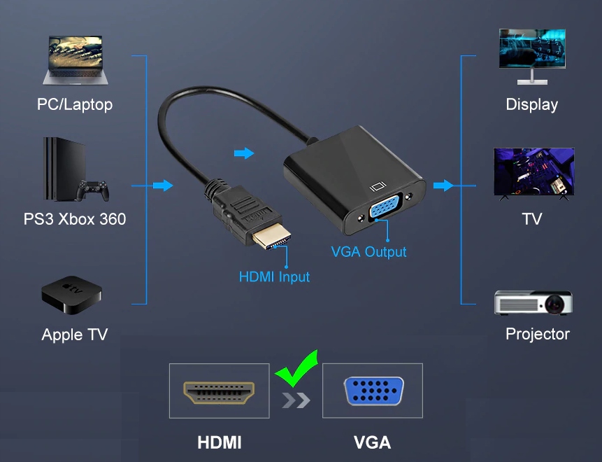 Конвертер работает только в одном направлении - с HDMI b> (например, ноутбук/планшет/приставка) на VGA (например, монитор/дисплей/проектор).