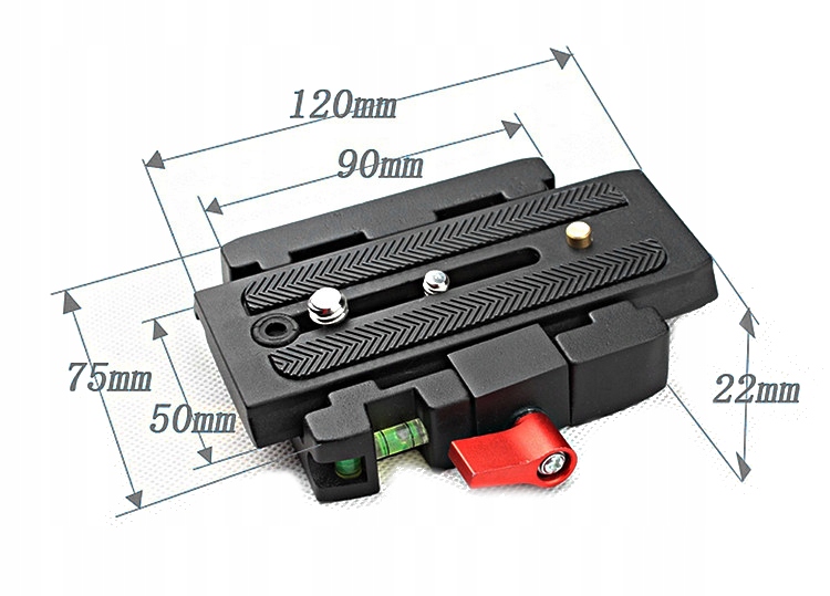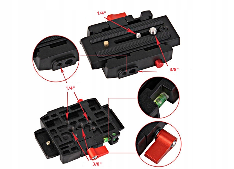 Переходник имеет два резьбовых крепежных отверстия 1/ 4 дюйма и 3/8 дюйма и четыре симметрично расположенных отверстия без резьбы. Он также оснащен замком, предотвращающим выскальзывание, и двумя уровнями.