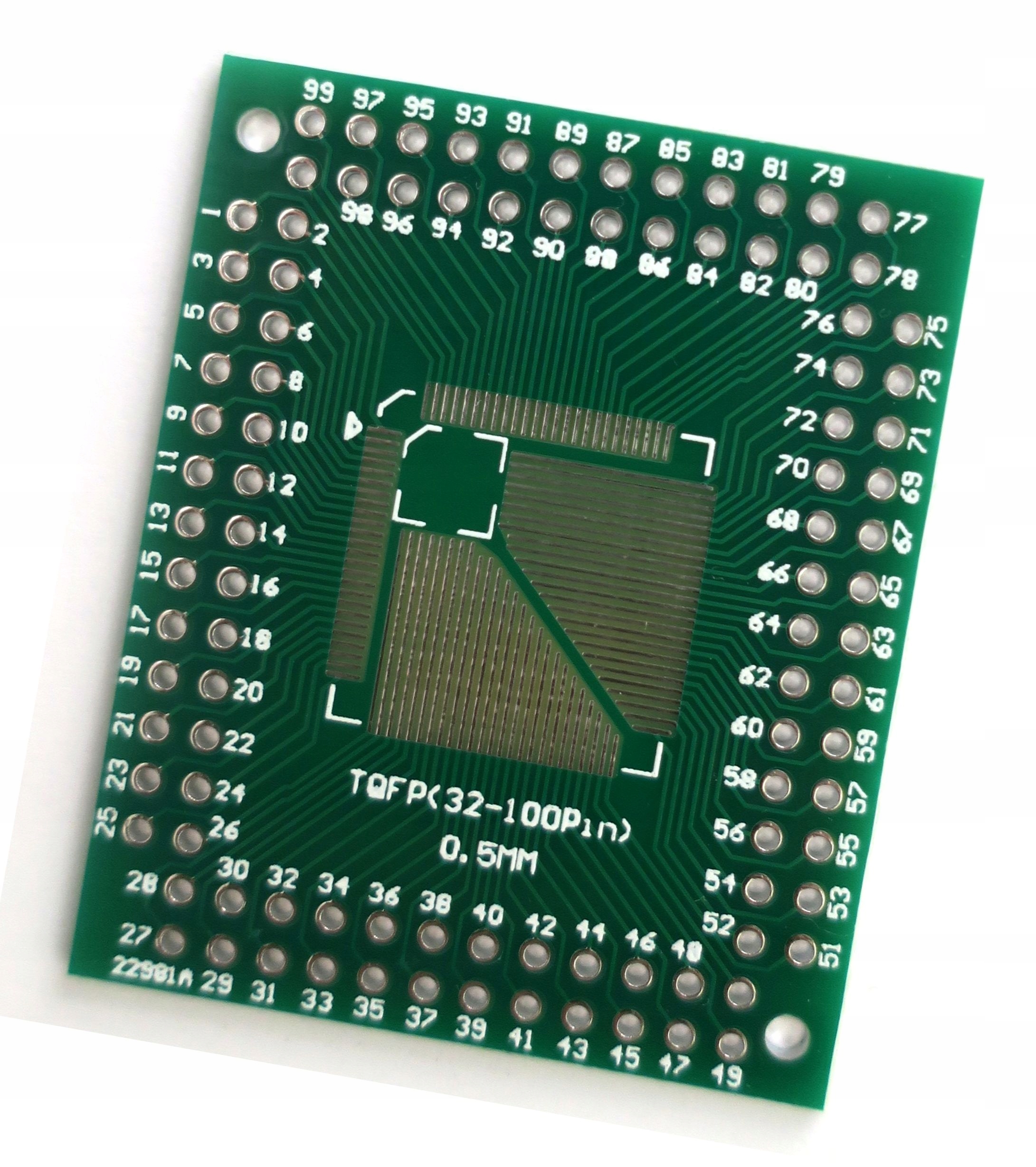 Универсальный двусторонний адаптер, позволяющий устанавливать системы TQFP SMD на универсальные платы, подходящие для монтажа компонентов THT. Можно использовать системы TQFP от 32 до 64 контактов с шагом 0,8 мм и от 32 до 100 контактов с шагом 0,5 мм.
