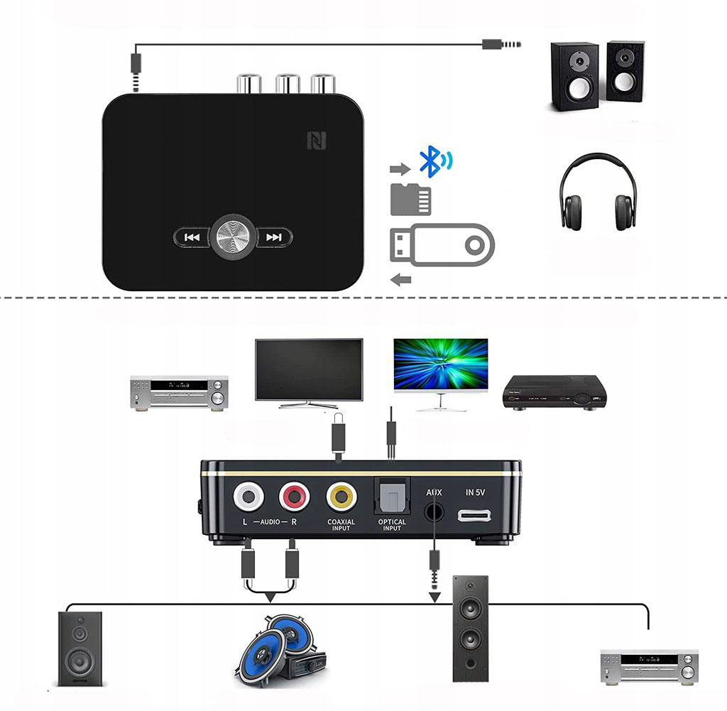 - Обладает усовершенствованным чипом Bluetooth 5.0 для обеспечения стереофонического аудиосигнала Hi-Fi Bluetooth без потерь для потоковой передачи музыки на динамики AUX или Входы RCA, автомобильная или домашняя стереосистема.