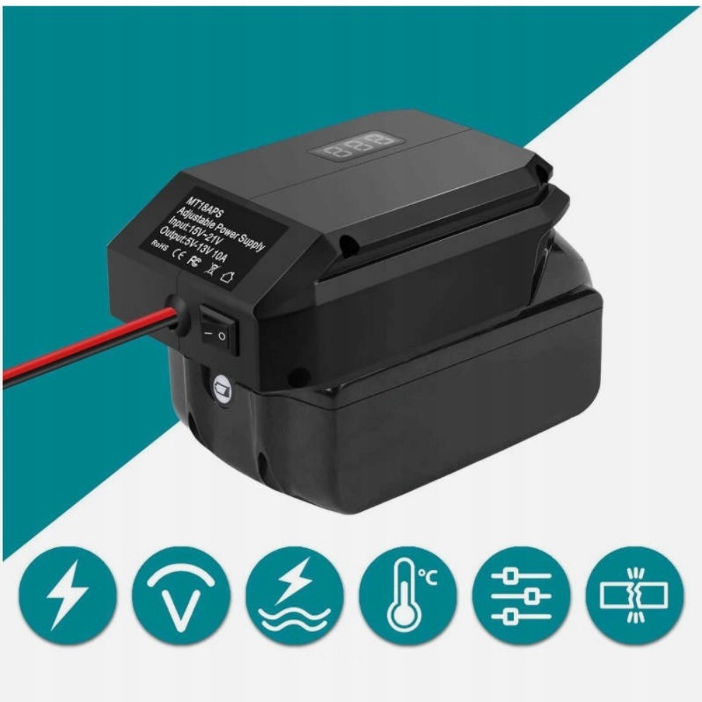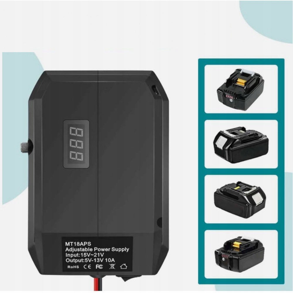 Входы 18–21 В постоянного тока (идеально подходят для аккумуляторов Makita 18 В), а также выходы 12 В постоянного тока (фиксированные) и 5–13 В постоянного тока (регулируемые), с максимальным выходным током 10 А и эффективностью ≥95%.