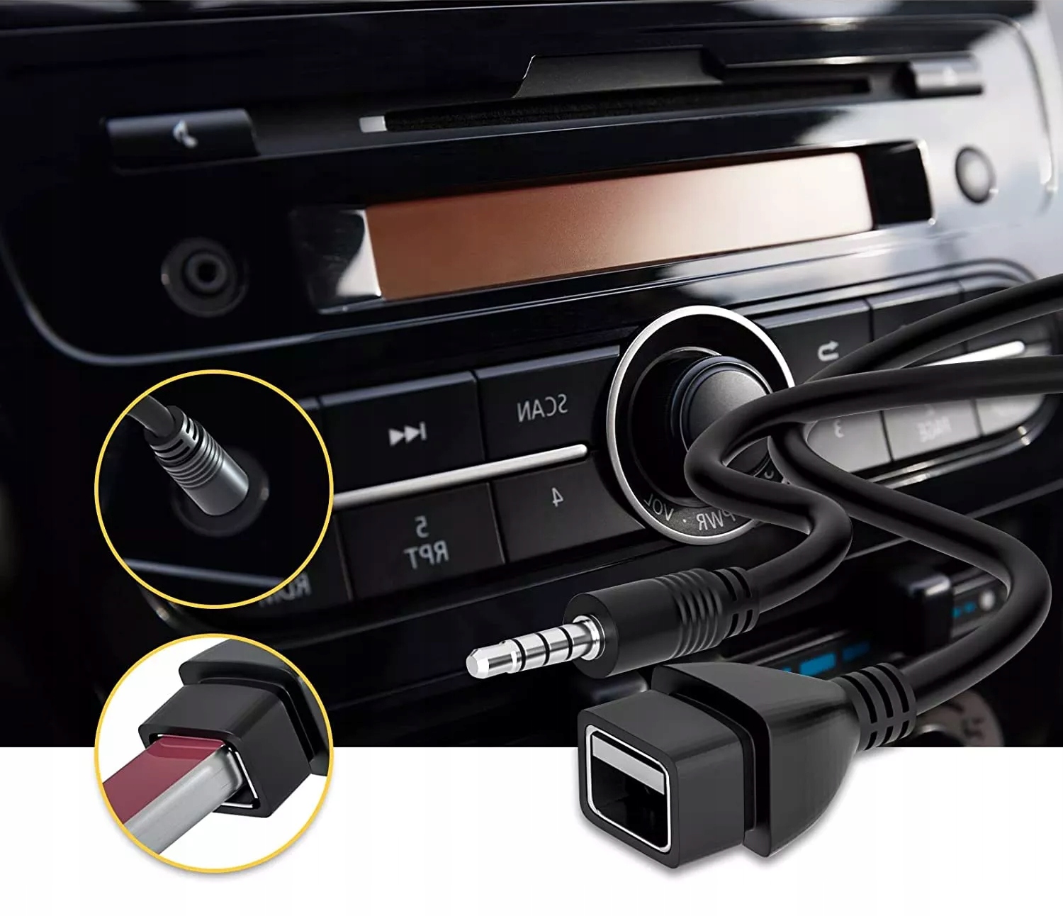 Адаптер с мини-разъемом на USB — позволяет отправлять цифровой сигнал на устройство, поддерживающее этот тип адаптера (например, некоторые автомобильные радиоприемники). Адаптер передает сигнал один в один между 4-контактным разъемом USB и 4-контактным разъемом мини-джек. Адаптер очень маленький и удобный. Он изготовлен из очень прочного АБС-пластика, что обеспечивает долговечность.