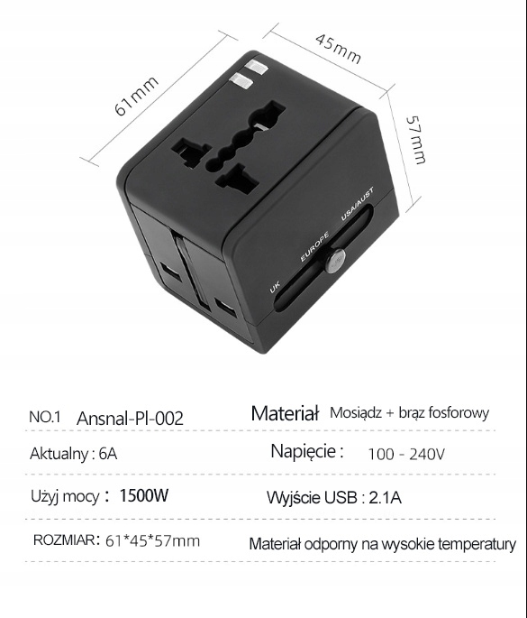 ADAPTER PODRÓŻNY GNIAZDO ŚWIATOWE ZASILANIE USB USA UK AU EU PL