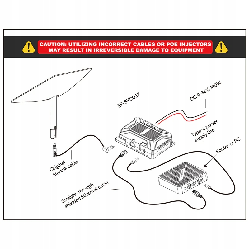 ep-sk0057 -это устройство Power Over Ethernet (POE), которое может обеспечить высокую мощность (до 180 Вт) и поддерживает стандарты Gigabit Ethernet (GIGE). Он имеет порт POE (стандартные антенны Starlink V2) для источника питания и порт LAN - для маршрутизатора или другого сетевого устройства, а также USB 12V 3A и USB -C 5V 3A розетки.