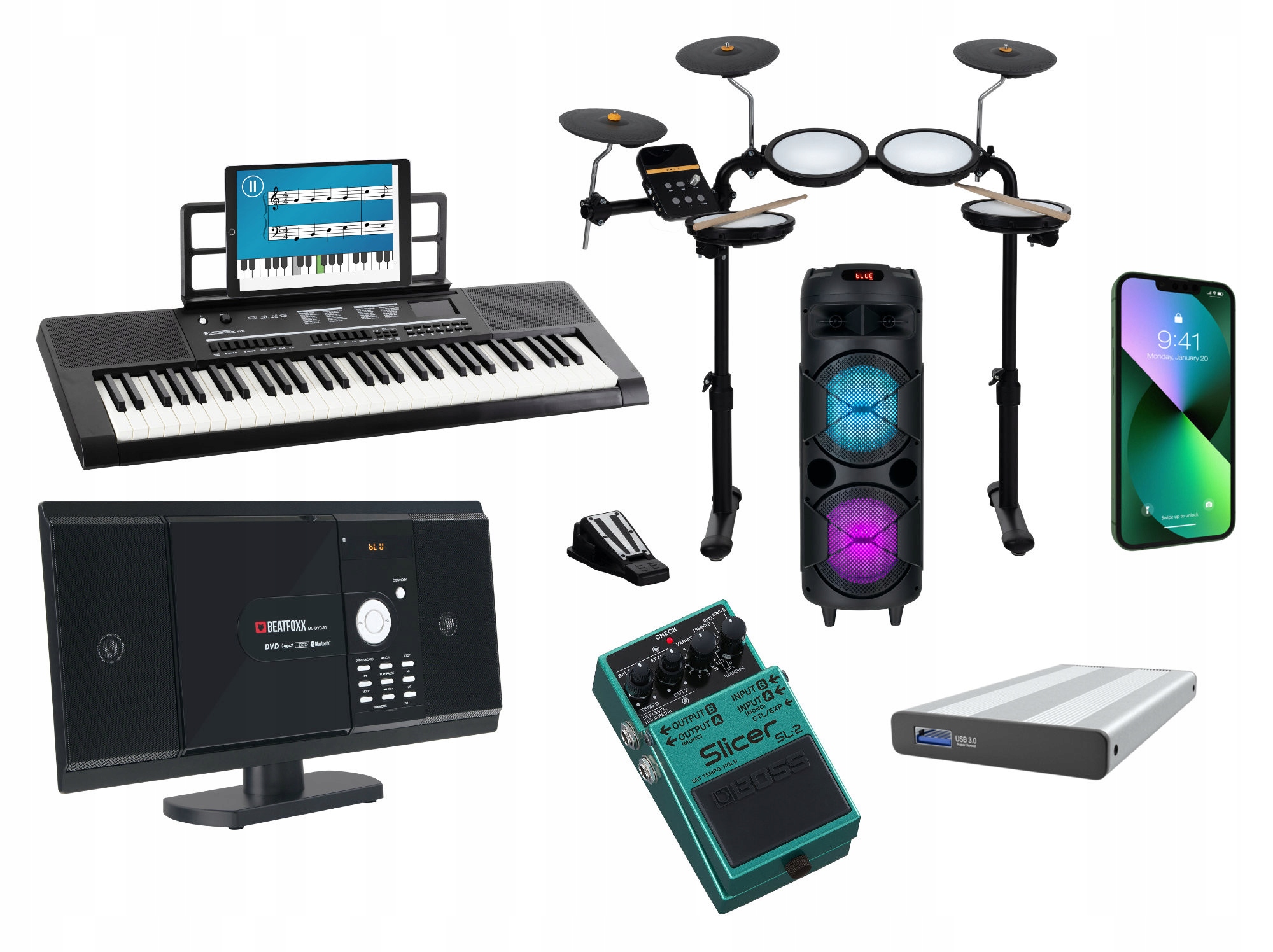 Восемь различных разъемов подходят для подключения обычных электронных устройств. Будь то радио, телефон, эффекты или бытовая электроника – почти каждый найдет здесь то, что ищет. В комплект также входит USB-адаптер, поэтому можно подключить и USB-кабель.