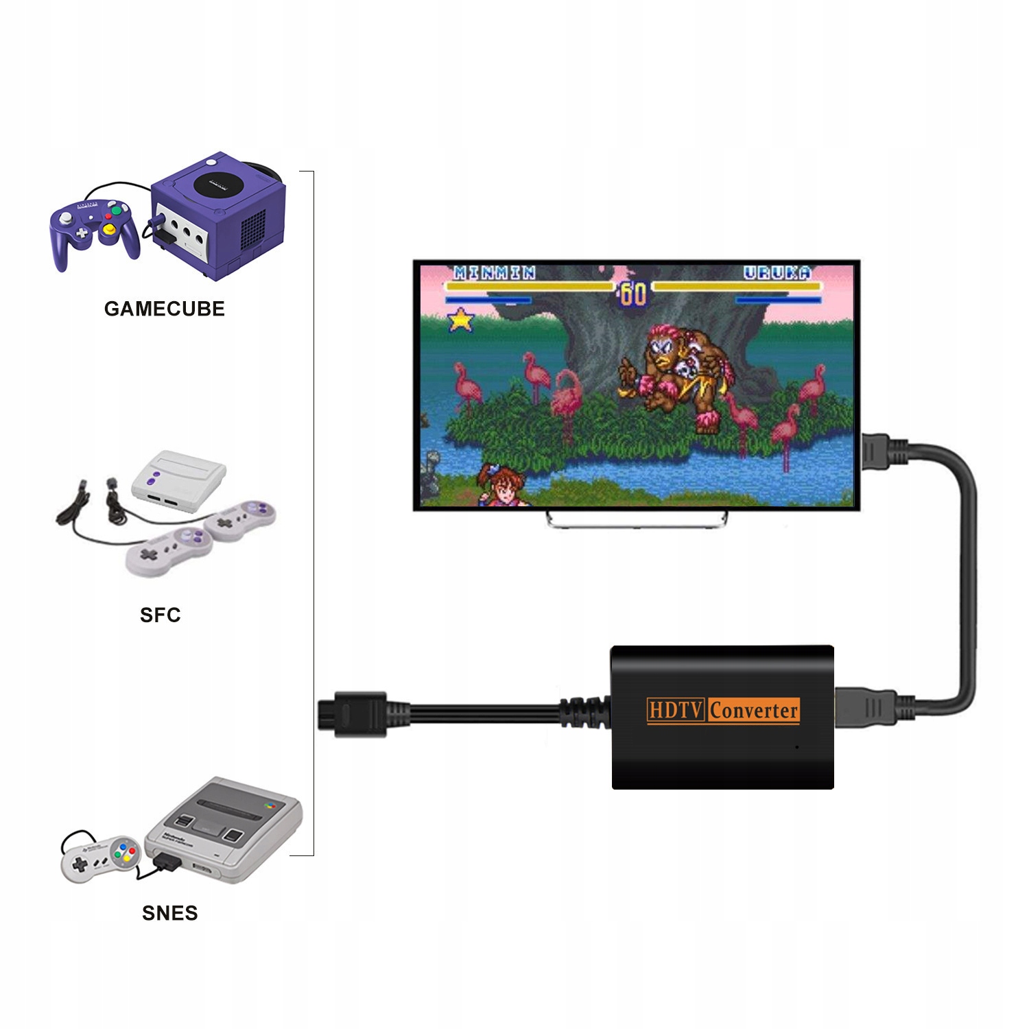 Адаптер позволяет подключить консоль Super Nintendo (SNES) к входу HDMI телевизора. Адаптер передает изображение и звук на телевизор через кабель HDMI.