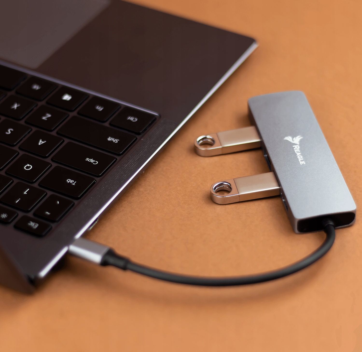 RHUB42C от бренда Reagle — активный хаб со штекером USB-C, который позволит вам расширить любимое устройство дополнительными портами, независимо от того, работаете ли вы на настольном компьютере, ноутбуке или даже телефоне. . Он имеет четыре порта USB-A, к которым можно подключить флешку или жесткий диск для загрузки данных с носителя, а также мышь и клавиатуру для большего комфорта работы. Дополнительный порт USB-C позволяет подключать питание.