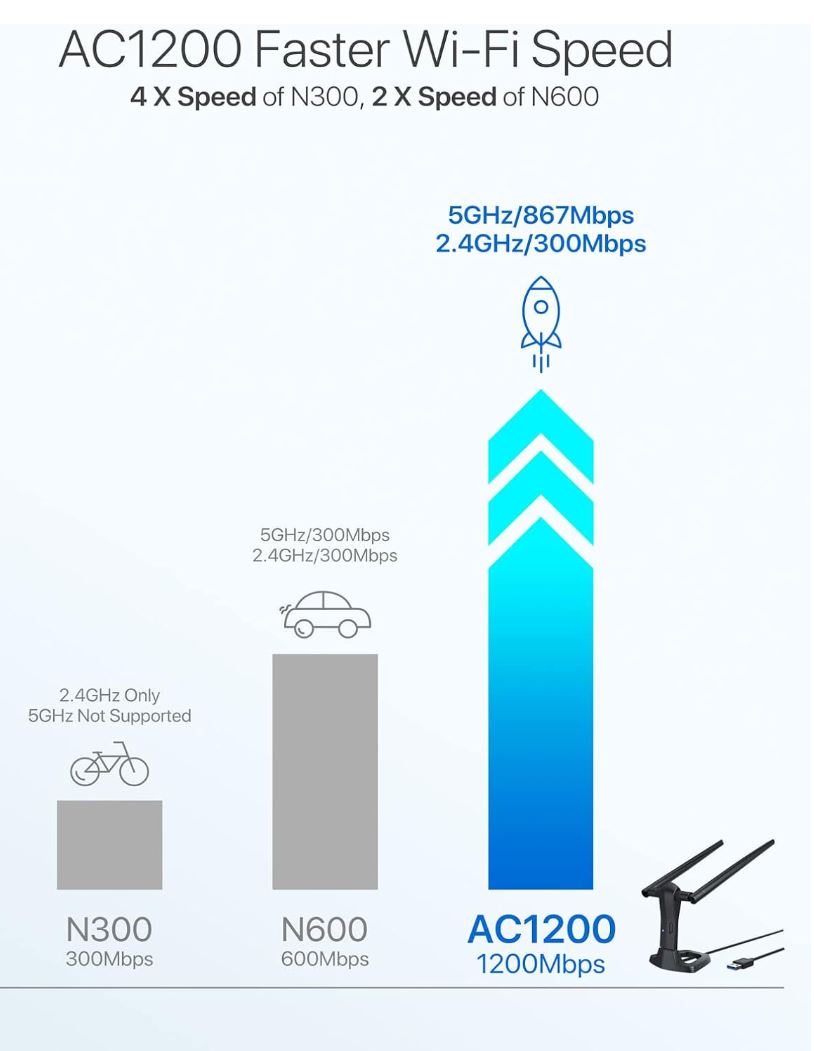 Наслаждайтесь скоростью до 867 Мбит/с на полосе 5 ГГц и 300 Мбит/с на Группа 2.4GHz - идеально подходит для потокового видео в 4K 🎥, онлайн -воспроизведение 🎮, прослушивание музыки 🎶 и просмотр Facebook и других социальных сетей! 🕹