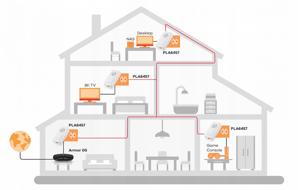 PLA6457 меняет способ подключения пользователей к дому с помощью новой технологии G.hn! Он преобразует ваши электрические розетки в высокоскоростную сеть, одновременно расширяя доступ в Интернет по всему дому. Обеспечивая скорость до 2400 Мбит/с, он идеально подходит для потоковой передачи 8K и обеспечивает возможность играть в онлайн-игры без задержек.