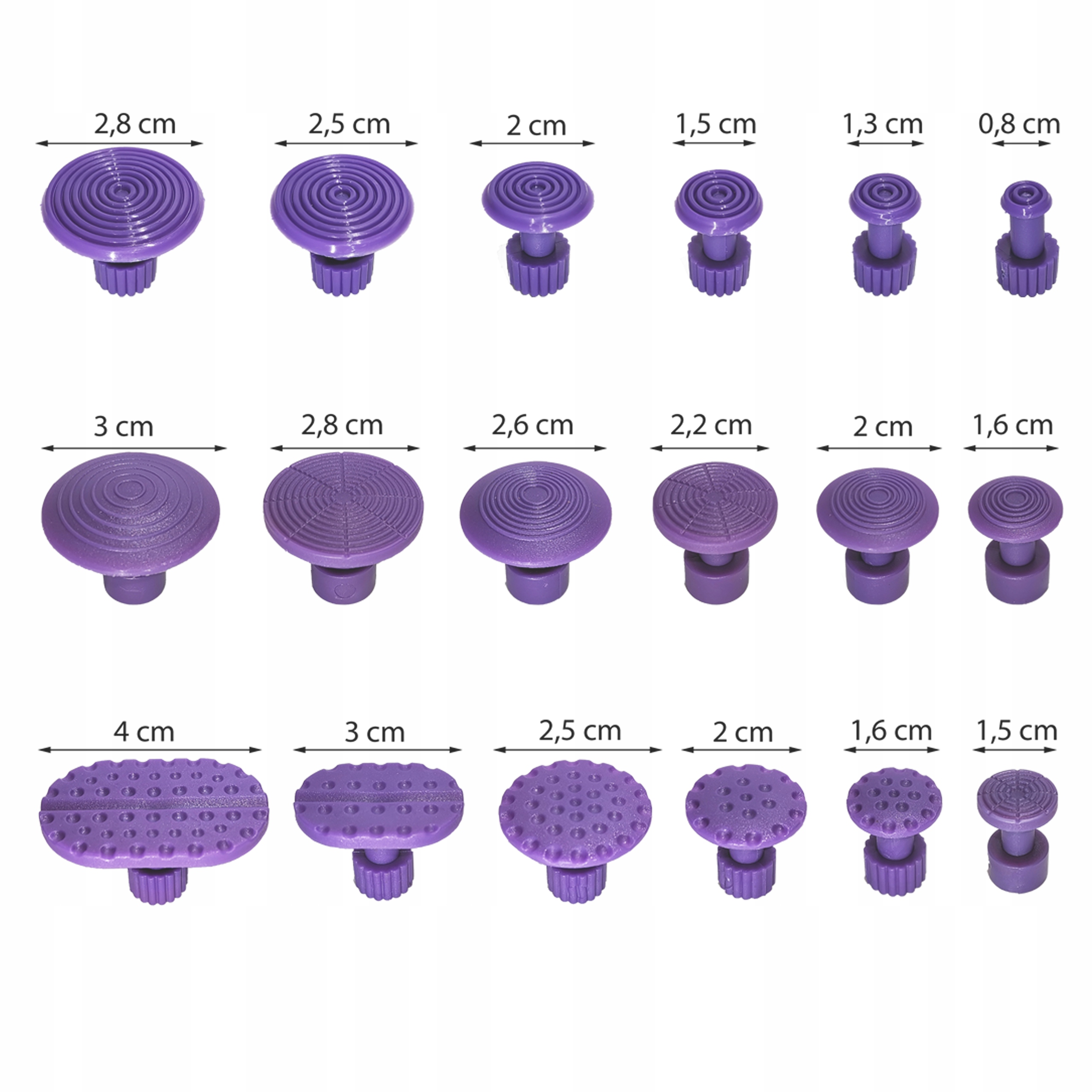 18 адаптеров различных форм. Это число позволяет легко адаптировать соответствующий адаптер к форме вмятины. Следовательно, это позволяет восстановить как небольшие, так и большие вмятины.