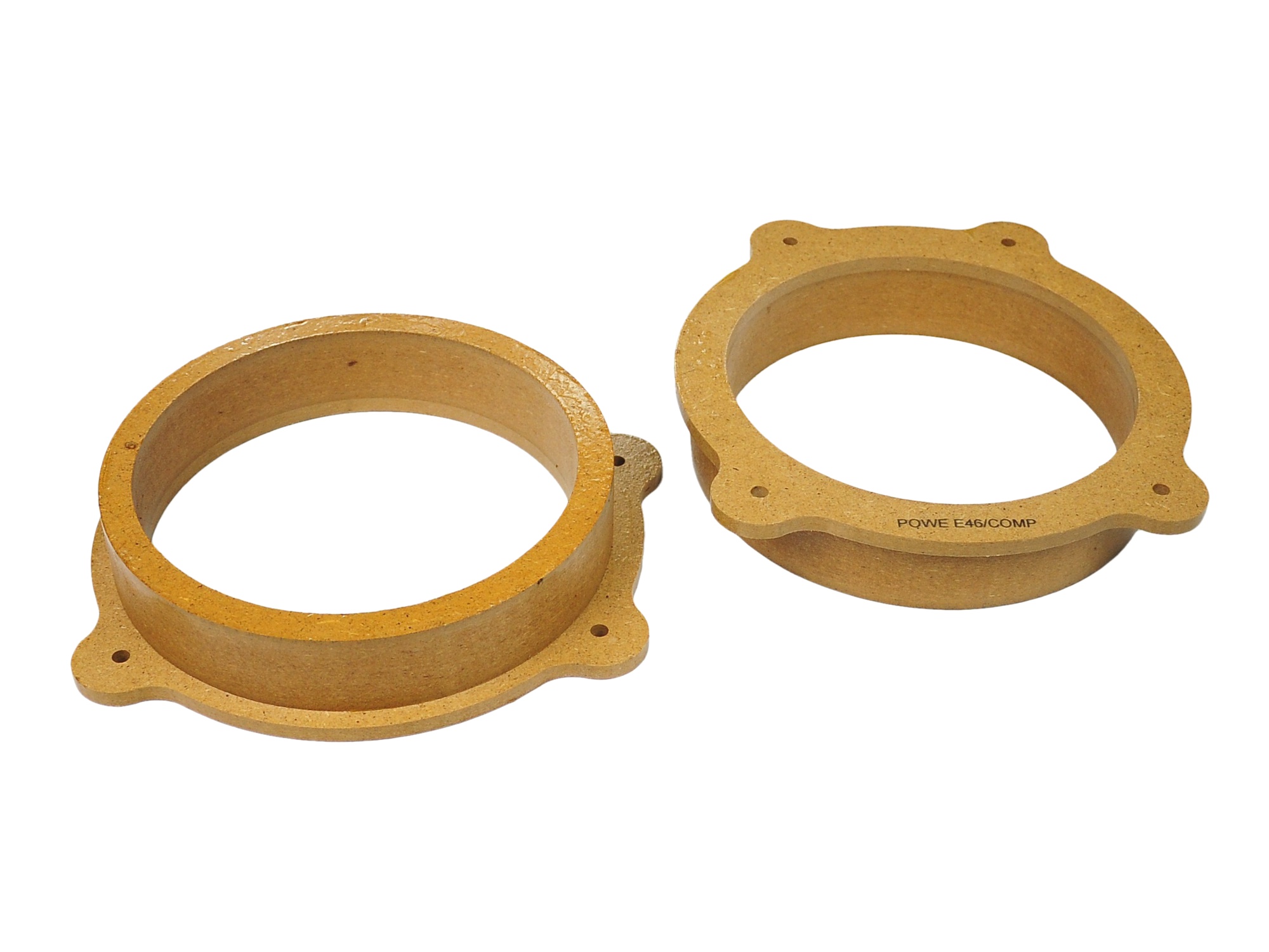 Проставки динамиков с пропиткой и двойным лакированием из МДФ, предназначены для устойчивой установки динамиков в заводские места крепления автомобиля. Качество и точность изготовления обеспечивается технологией ЧПУ. После фрезерования проставки Powe дополнительно шлифуются, а затем наносятся три слоя защиты от влаги (один слой пропитки и два слоя прозрачного лака). Шлифовка поверхности дистанционатора после фрезерования и лакирования позволяет получить плотное гладкое защитное покрытие на всей поверхности, включая линию реза, которое эффективно предотвращает проникновение влаги внутрь МДФ.