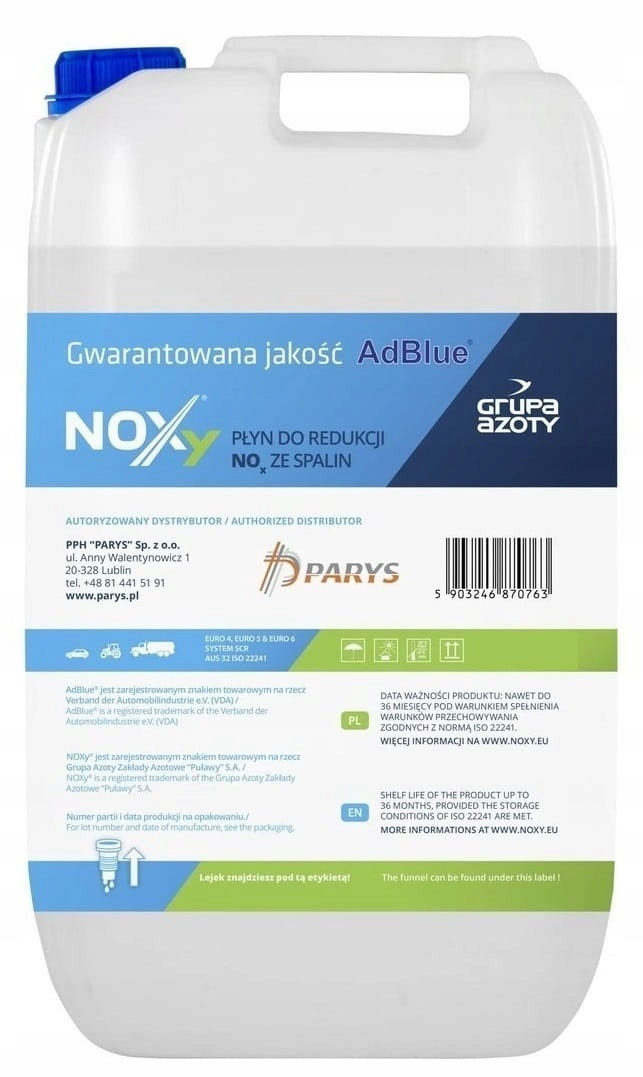 NOXy® AdBlue® — это дополнительное решение Grupa Azoty, предлагающее продукт высочайшего качества. Его изготовление происходит на современном производственном предприятии, поддерживающем 100% чистоту продукта - в соответствии со стандартом ISO 22241. Уникальное качество NOXy® AdBlue® подтверждено испытаниями, проведенными в единственной лаборатории, аккредитованной Польским центром аккредитации испытаний AdBlue.