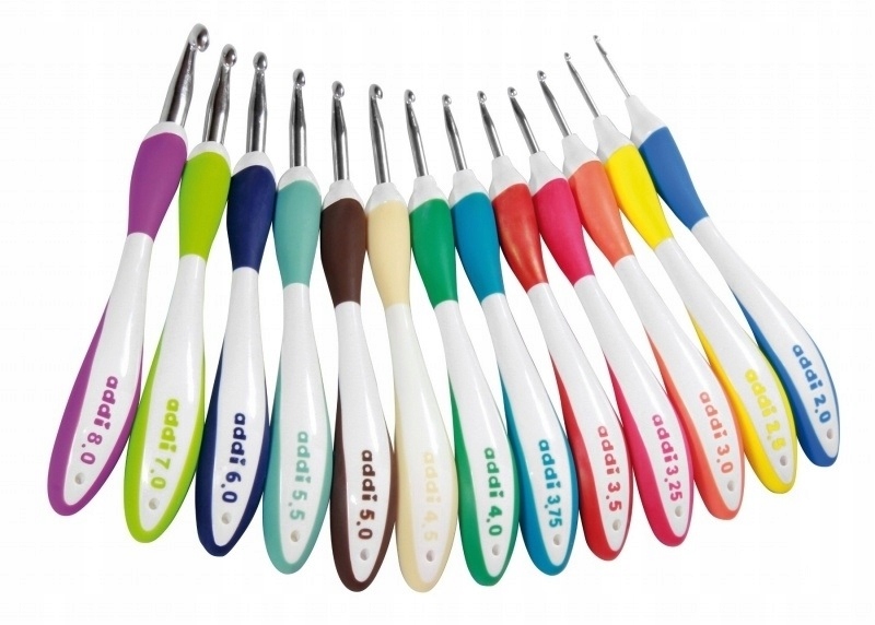 Адди -качание макси -вязаное вязание крючком изготовлено из латуни с никелями и пластиковой эргономической ручки, которая снимает руку и плечо во время вязания крючком. Ручки были перепроектированы и укреплены внутри - следовательно, они также будут работать среди людей, которые сильнее сжимают вязание крючком. По сравнению со стандартной версией в Crochet Addi Maxi использовались более длинные крючки.