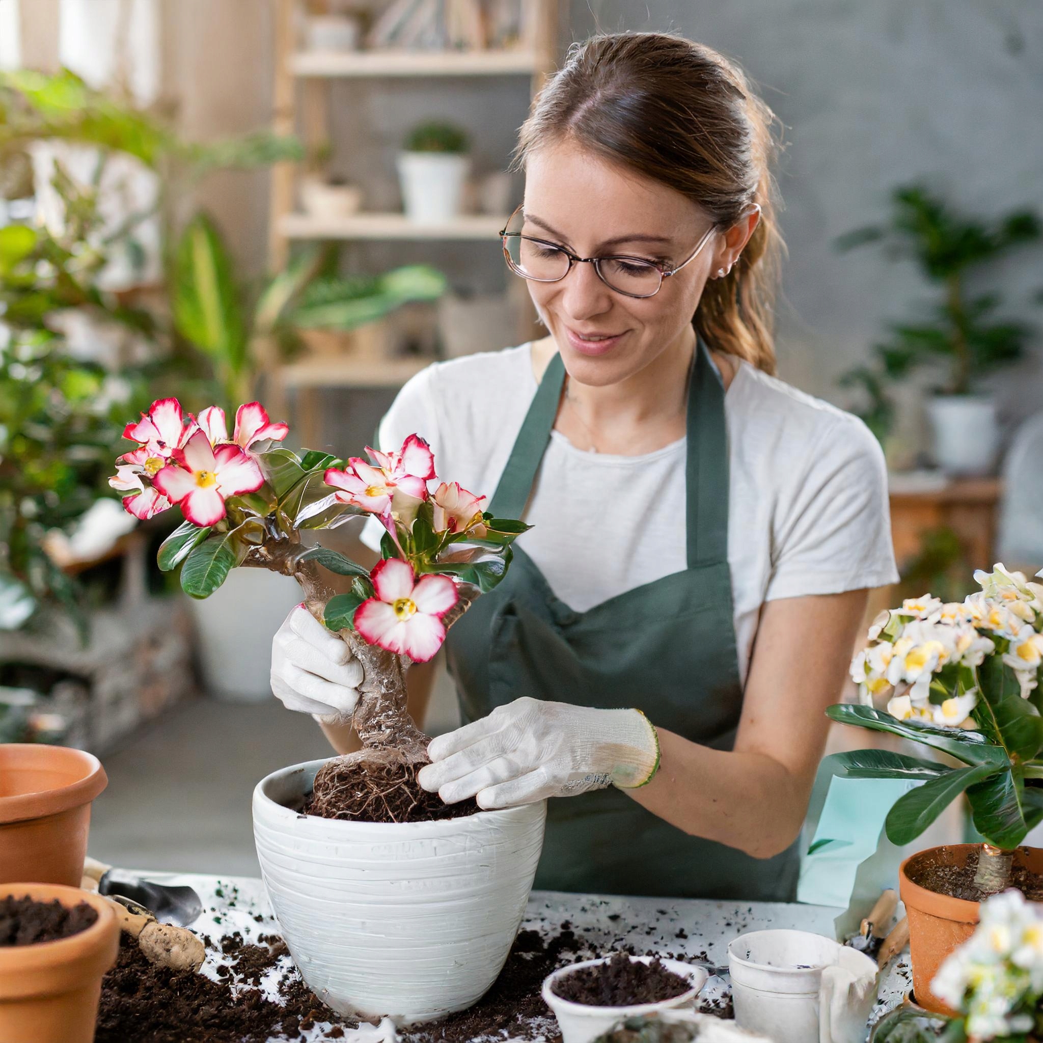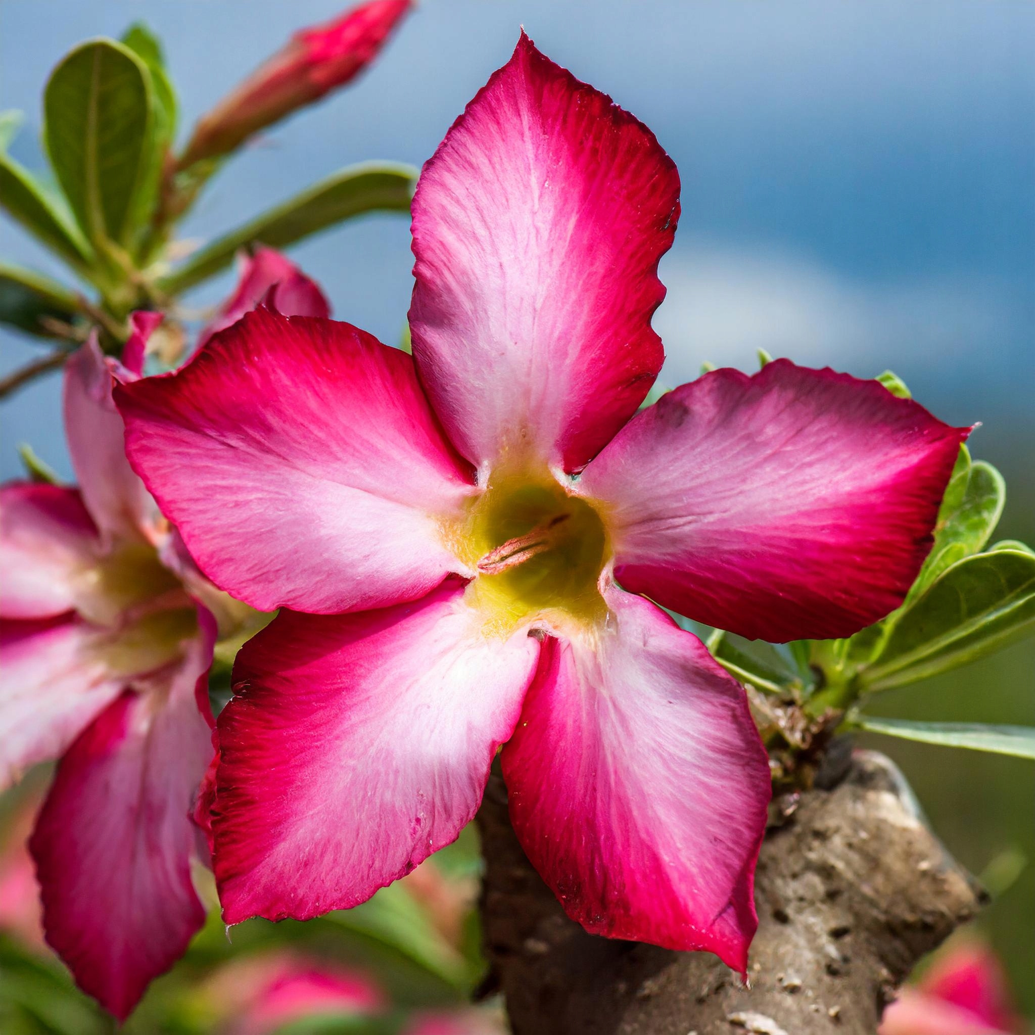 - Что еще стоит знать об адениуме: Это очень популярное растение, которое при правильном уходе дает красивые цветы. Растение называют розой пустыни, потому что оно прекрасно справляется своими соцветиями в неблагоприятных жарких условиях. Также называется мини-баобаб. По мере роста адениум принимает форму бонсай, развивая свой ствол. Если растение растет только вверх, следует дать ему время разветвиться и создать широкий каудекс. Также стоит помнить, что опадение листьев не является симптомом заболевания, перелива или возникающих проблем. Это естественный признак формирования ствола — состояние растения следует оценивать по каудексу (стволу). Если он мягкий, это признак недостаточной гидратации. Если он приобрел тревожный желтый цвет, это означает, что растение перелито.
