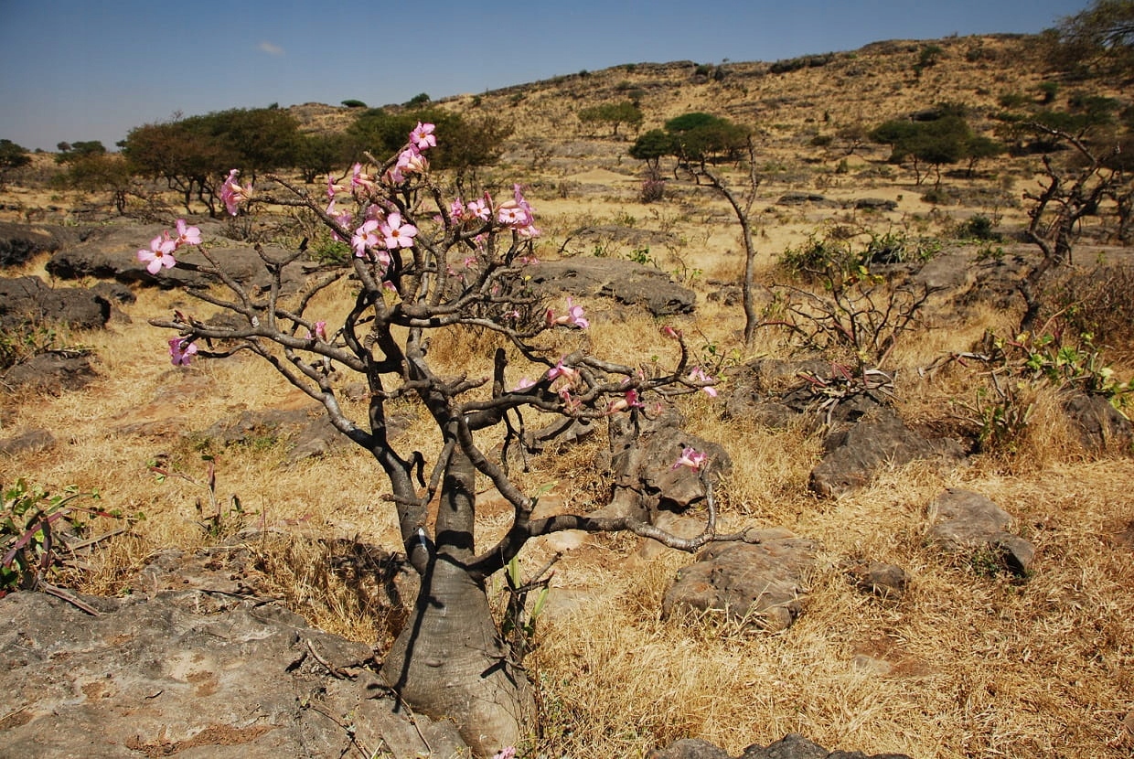 Растение под названием роза пустыни. В естественной среде произрастает в пустынных и полупустынных районах Центральной Африки и Аравийского полуострова. Имеет форму цветущего дерева, напоминающего баобаб. Стебель массивный, широкий внизу и более тонкий вверху. Имеет способность накапливать воду. Из толстого ствола растут массивные побеги. Листья блестящие, темно-зеленые. Адениум пышно цветет с апреля по сентябрь, цветки пятилепестковые, диаметром 5-12 см. Они собраны в ярко-розовые гроздья.