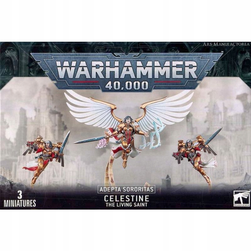 Этот пластиковый набор, состоящий из нескольких частей, содержит компоненты, необходимые для сборки Селестины, Живой Святой, и ее двух сопровождающий Geminae Superia. Она носит Доспехи Св. Екатерины, набор великолепных золотых блюд, наполненных святыми иконами и скульптурными символами. Модель удерживается над основанием благодаря писанию, которое прикреплено к ее развевающемуся плащу – даже эта деталь затмевается огромными крыльями, которые торчат из ее рюкзака, с железным нимбом с шипами над ее восторженным лицом. Сверкающий Пылающий Клинок в ее правой руке расцветает розами, а слева от нее выпущена пара голубей. Ее сопровождает Geminae Superia, одетая в аналогичную броню (с меньшим размахом крыльев) и агрессивно владеющая болт-пистолетами и силовыми мечами.