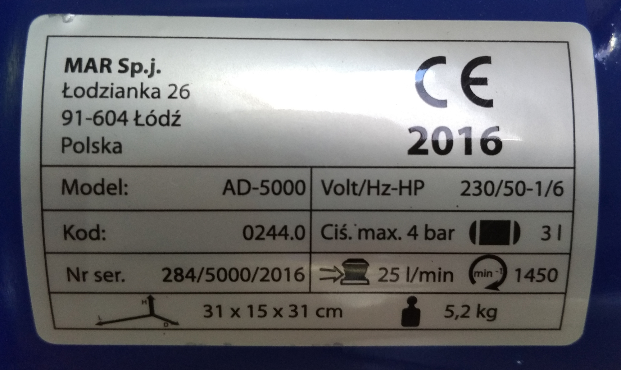AD-5000 оснащен реле давления, автоматически отключающим насос после наполнения баллона сжатым воздухом до давления 4 бар. Он перезапускает насос, когда давление в баке падает до 3 бар.