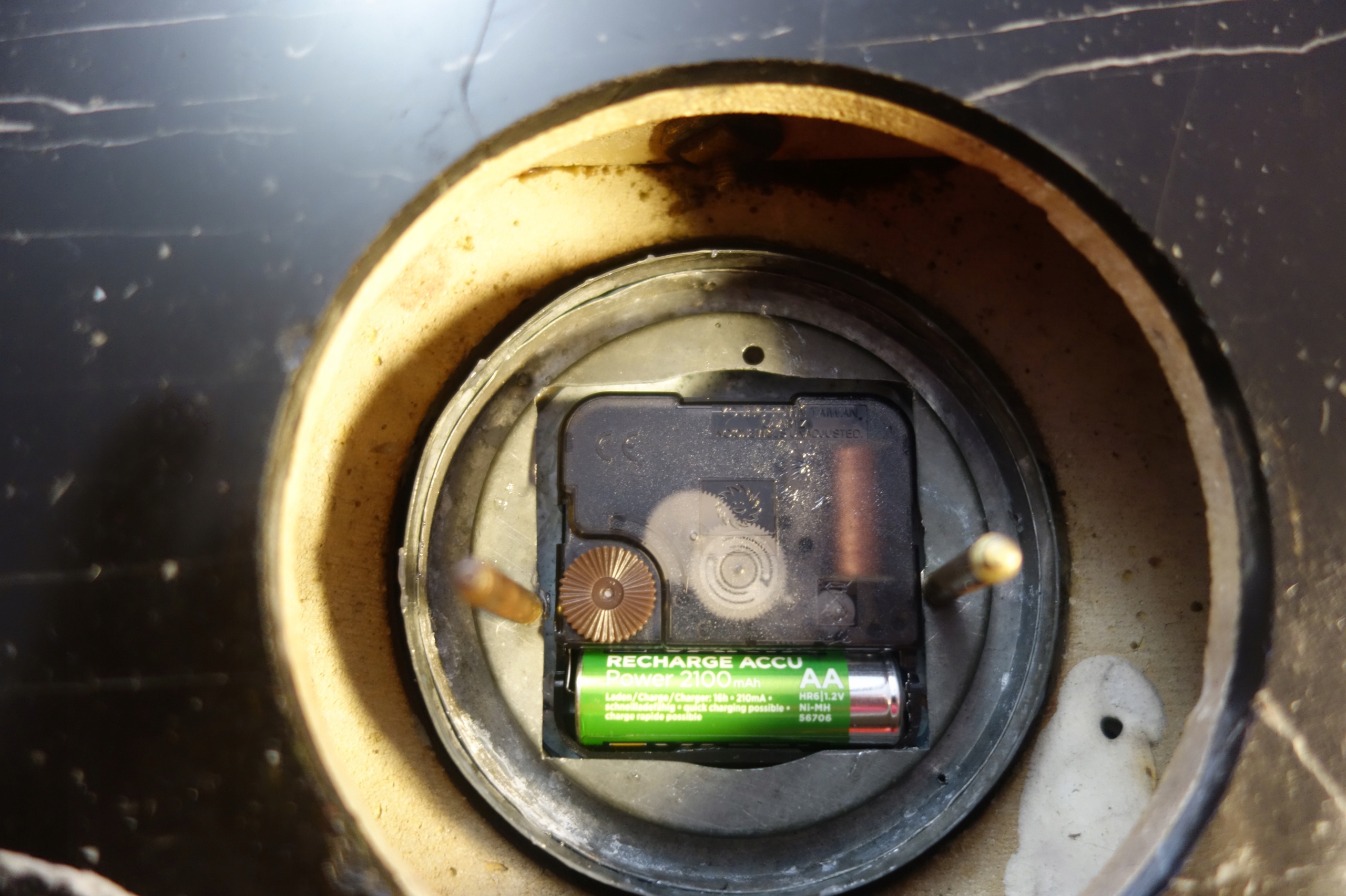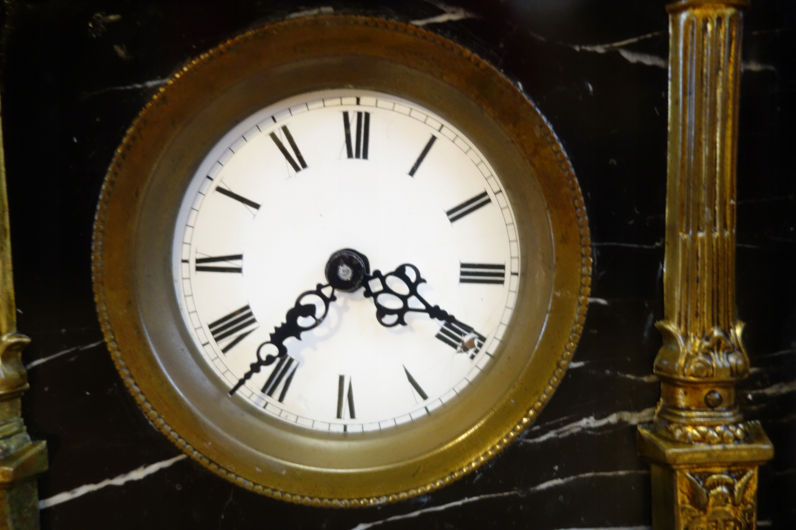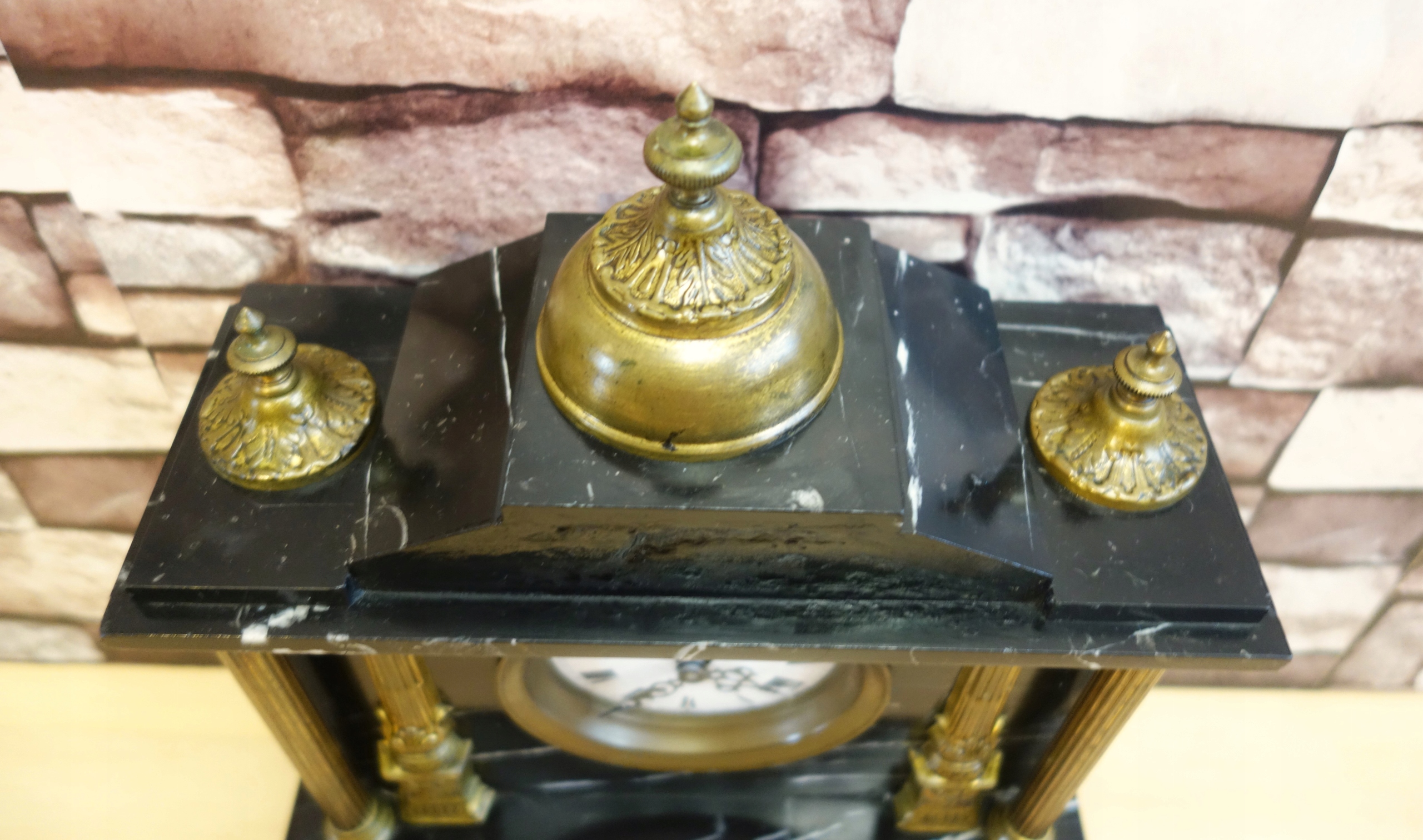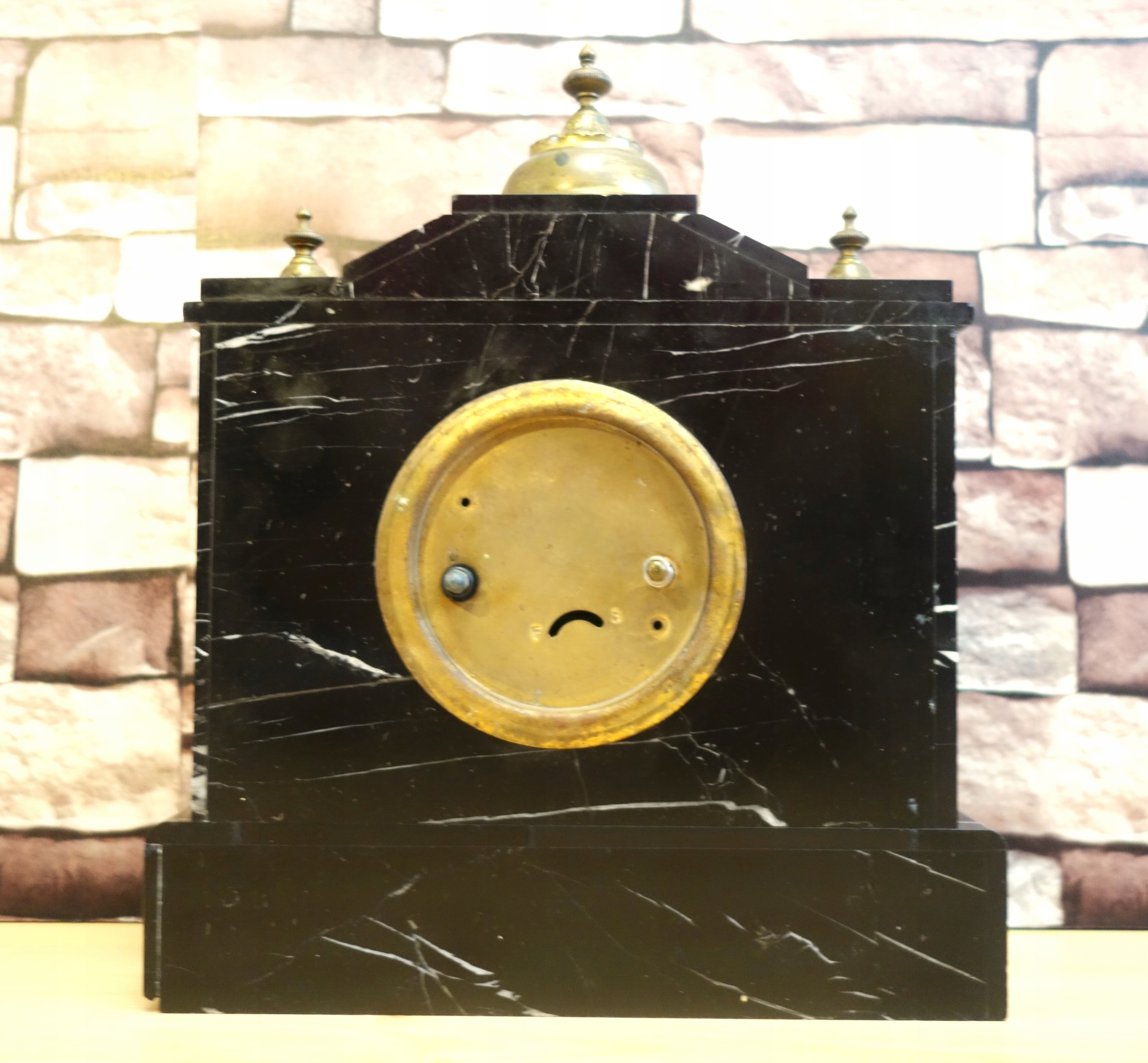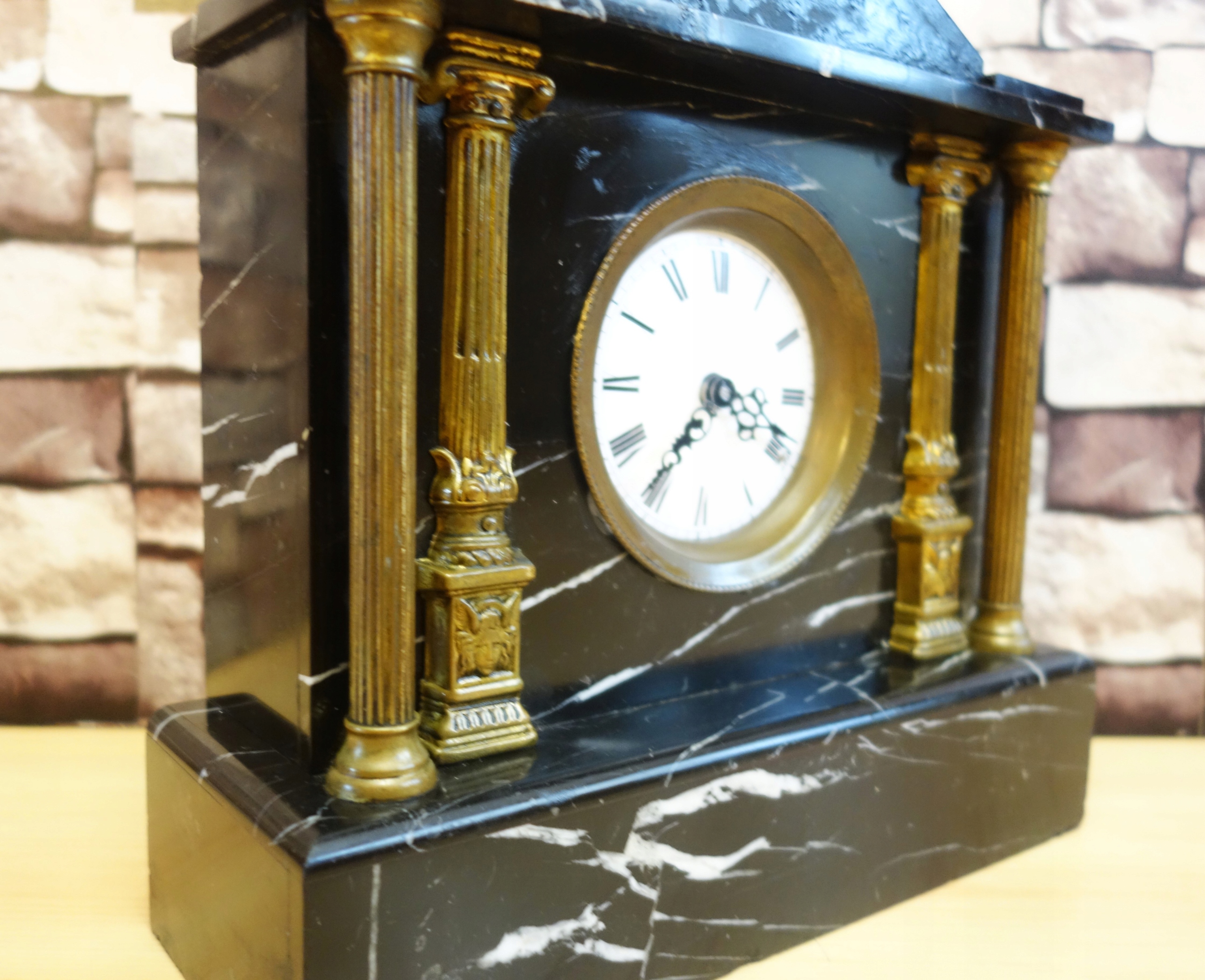 Часы полностью выполнены из черного полированного мрамора и фурнитуры из латуни.На циферблате четкие арабские цифры, механизм изменен на кварц, точно показывает время