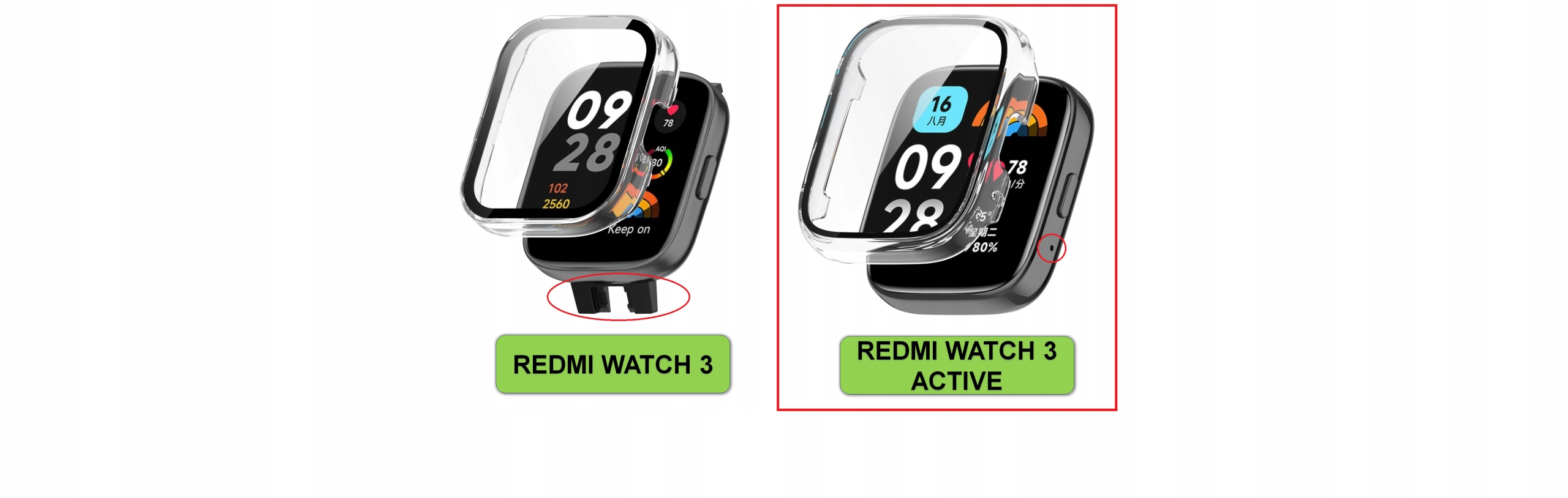 Xiaomi Redmi Watch 3 и Xiaomi Redmi Watch 3 Active — это не одни и те же часы, и их аксессуары различаются. Перед совершением покупки убедитесь, что у вас есть часы Xiaomi Redmi Watch 3 Active (разница показана на рисунке ниже)