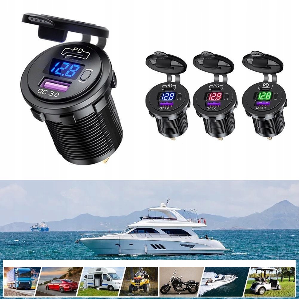 Ładowarka MOTOCYKLOWA samochodowa USB QC3.0 USB-C PD Woltomierz 12-24V