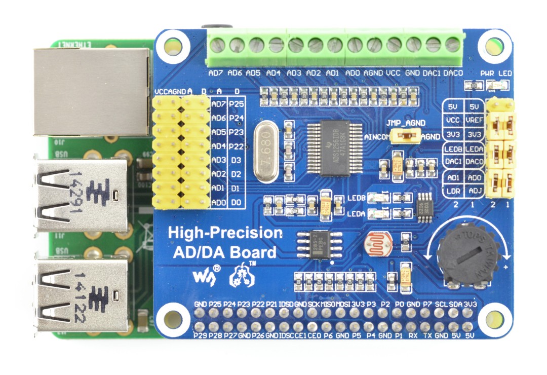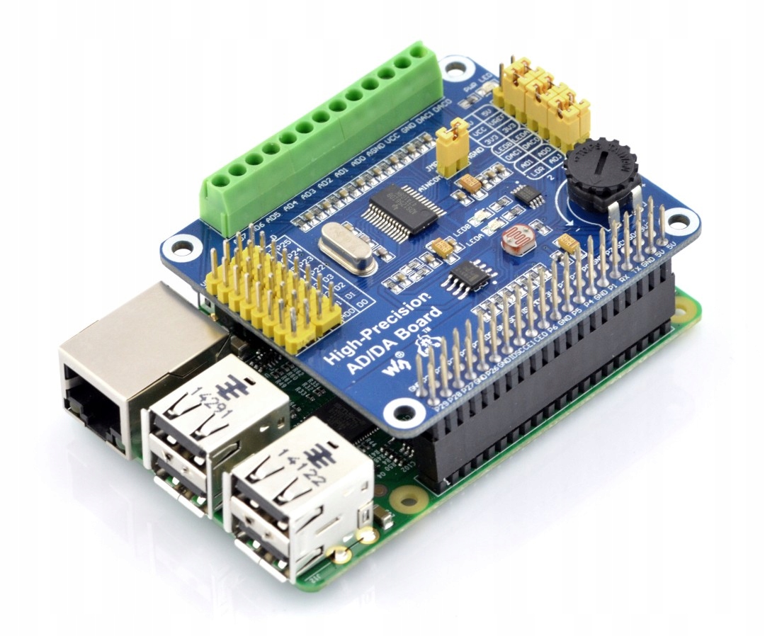 Модуль с высокоточным АЦП и ЦАП в виде накладки на разъемы GPIO Raspberry Pi. Он имеет 2 16-битных аналоговых выхода и 8 24-битных аналоговых входа. Обмен данными осуществляется через интерфейс SPI. На плате также имеются потенциометр и фоторезистор, подключенные к входным каналам. Работает с версией Raspberry A+/B+/2B/3B.
