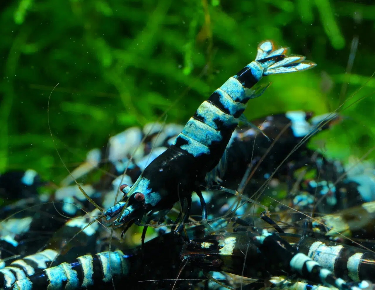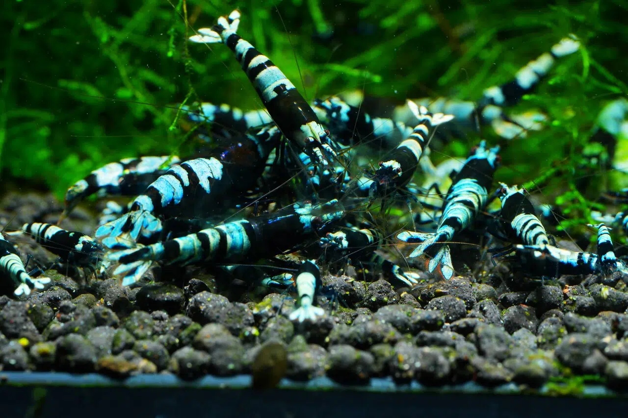 Advanced Nanashi Black — уникальный сорт креветок Caridina, ценимый опытными селекционерами за уникальный внешний вид и высокое генетическое качество. Характеризуется насыщенно-черным телом с блестящей поверхностью, контрастирующей с белыми или синими (теневыми) полосами, которые могут принимать форму неправильных узоров – типичных для линии Нанаши.