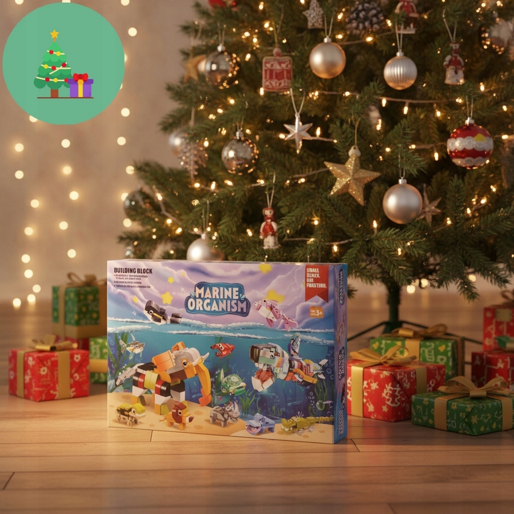 ⭐ 24 дня, 24 сюрприза! В каждом окне содержится набор мини-строительных блоков, из которых можно собрать одно из 24 животных (12 морских существ и 12 наземных животных).