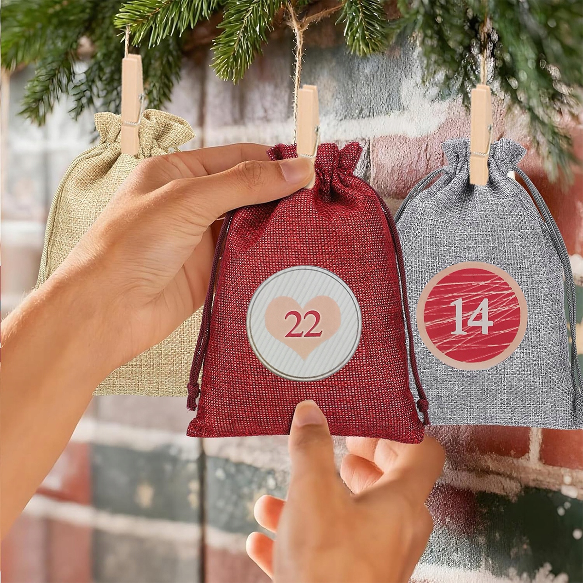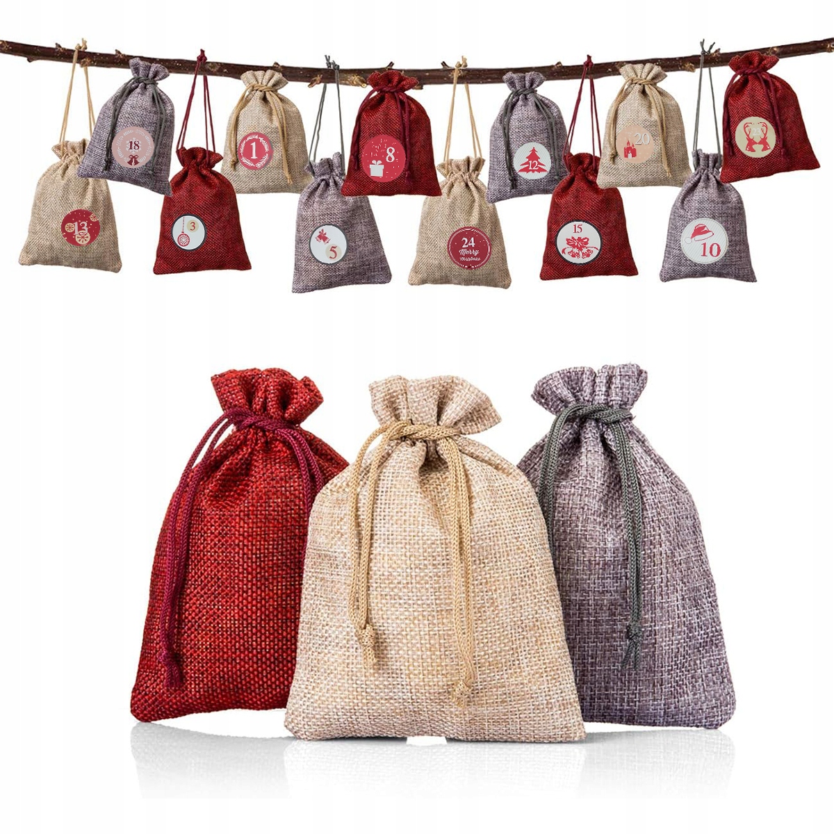 Окончательный вид мешочков решаете вы! В комплект входят специальные красочные наклейки для каждой сумки - удобный способ их нумерации. Адвент-календари для заполнения — прекрасная возможность создать что-то оригинальное и адаптировать подарки к потребностям вашего ребенка. Практичные джутовые сумки