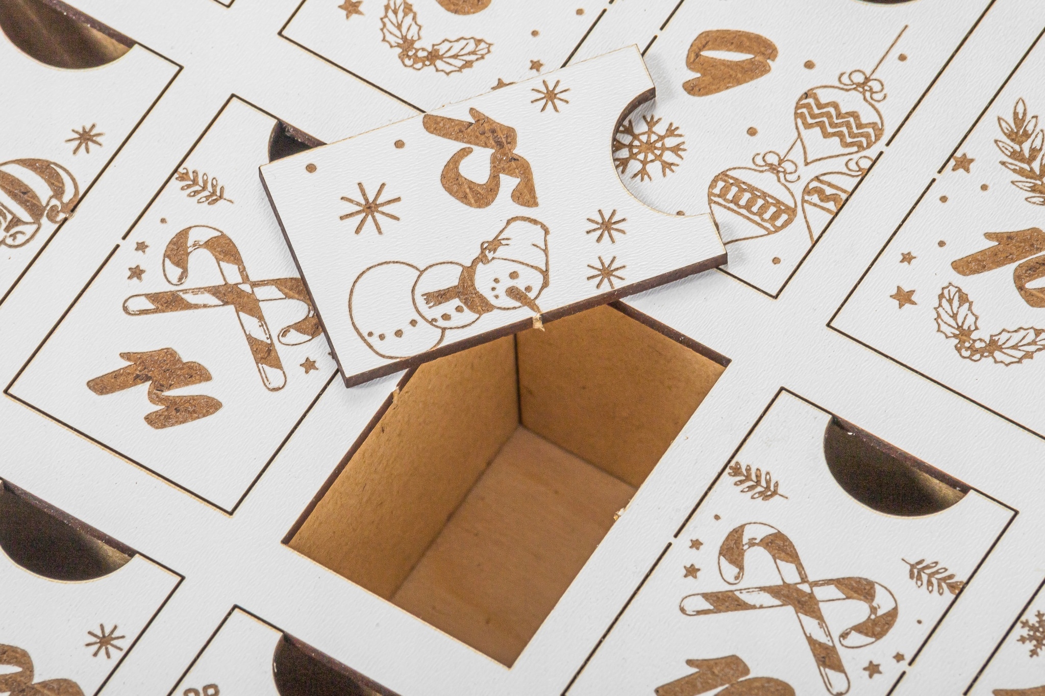 В календаре есть выдвижные ящики, которые легко заполнить, например, сладостями, а затем закрыть декоративной крышкой с цифрами.