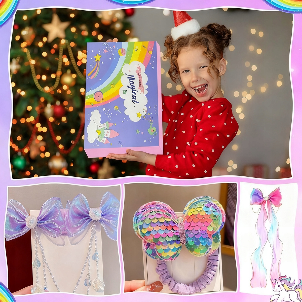 ✔️Изысканная заколка для волос с повязкой на голову «Русалка»: в адвент-календаре для девочек на 2025 год представлены изысканные бусины на голову в стиле принцессы и милые заколки для волос с большими бантами. Он выглядит мило и шикарно, воплощая мечты девочек-принцесс-русалок и их праздничные ожидания.