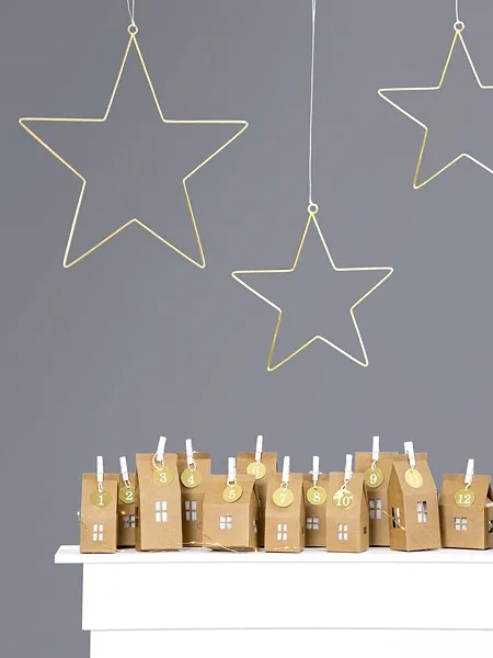 - подвески из золотой бумаги с напечатанными белыми цифрами от 1 до 24 (диаметр ок. 3 см)< /li>