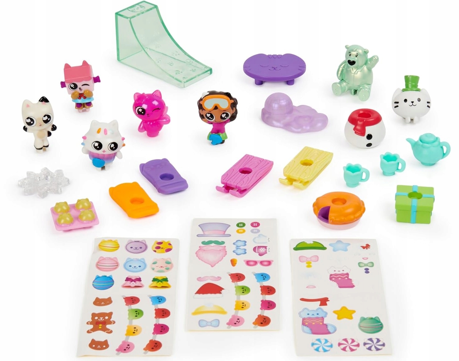 За каждой дверью ждет сюрприз. Помимо Габби в ее зимнем наряде и фигурок Baby Box, Кучи и Лапы Панды, в этот адвент-календарь также входят эксклюзивные фигурки. Вы также можете найти рождественские аксессуары, наклейки и многое другое.