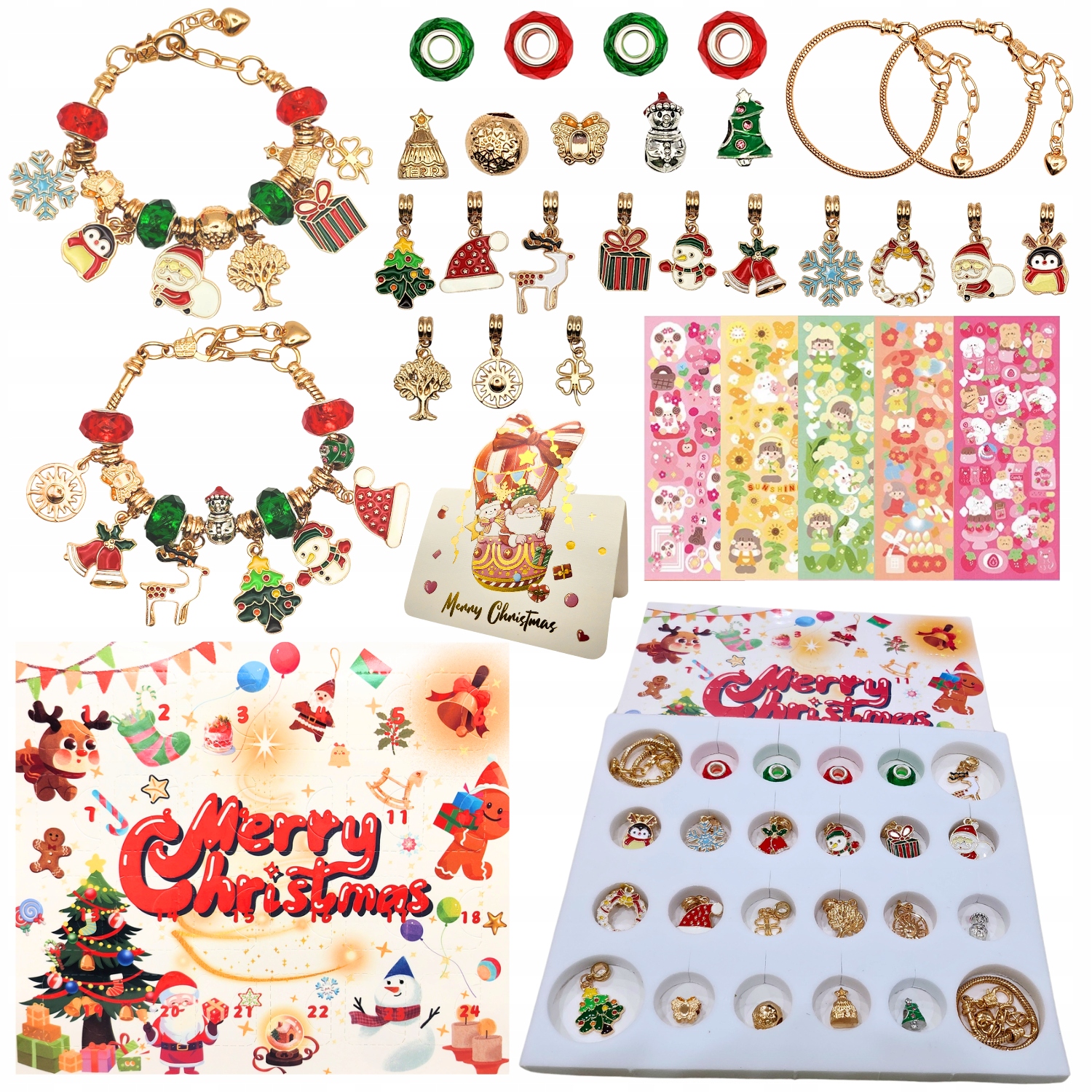 - Адвент-календарь для девочек включает в себя два металлических браслета длиной 21 см и 22 браслета-подвески, которые идеально подходят к Рождеству.