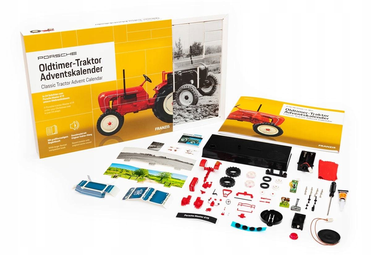 Старинные тракторы обладают особым шармом. Для любителей старинных коммерческих автомобилей теперь есть необычное рождественское удовольствие: благодаря старинному адвент-календарю для тракторов Porsche за 24 шага вокруг модели легендарного Porsche Master 419 создается увлекательный маленький мир приключений. Широкоформатный Путеводитель проведет вас через историю трактора.