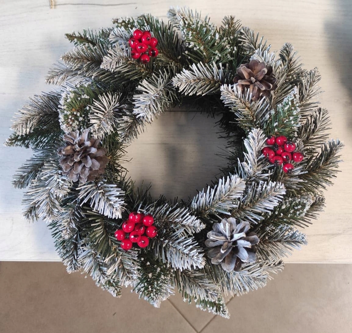 Венок изготовлен из зеленых рисунков елки. Кроме того, кончики ветвей обесцвечены и покрыты белыми кристаллами.
