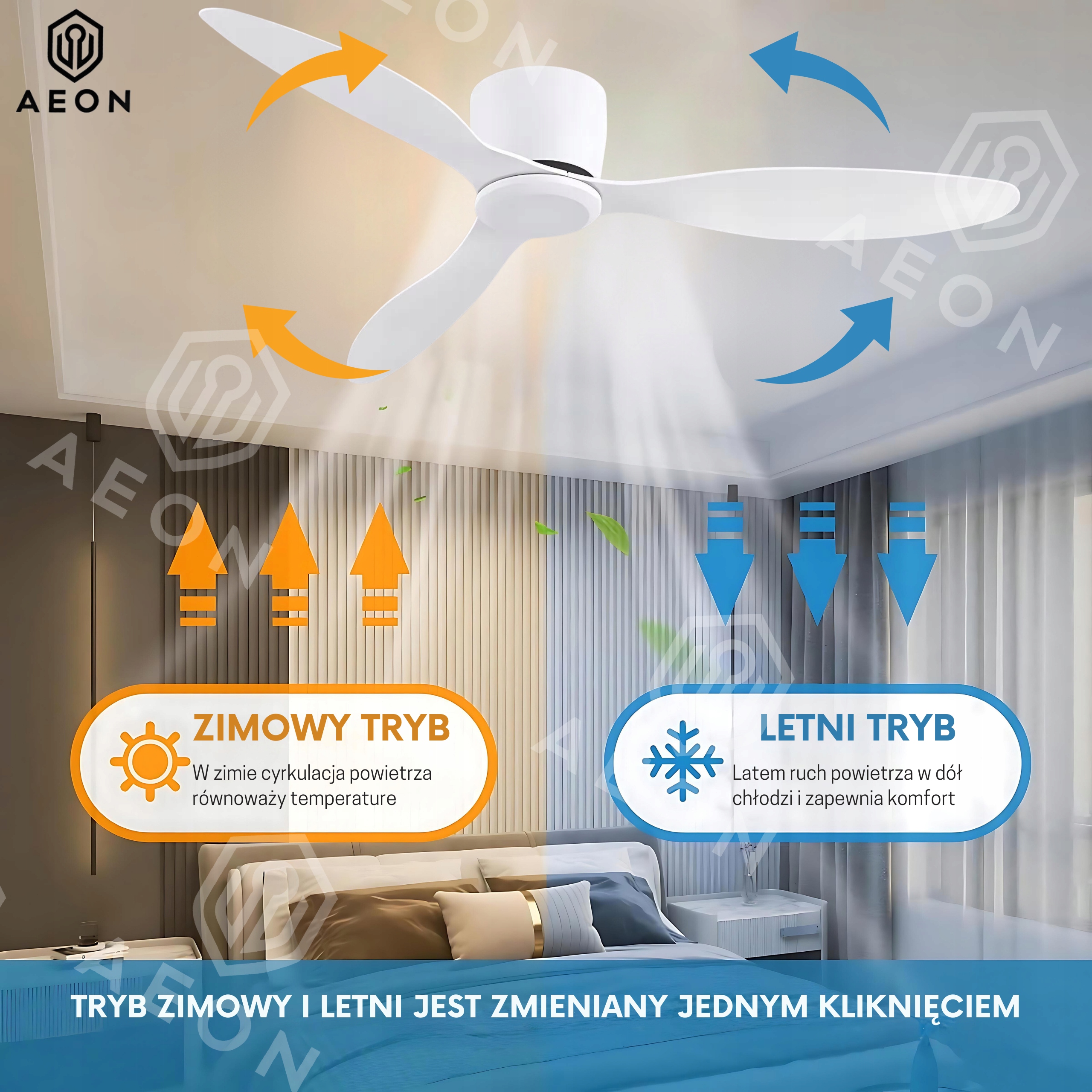 Потолочный вентилятор AEON — это сочетание современного дизайна и практичных решений. Его белая элегантная отделка добавит классности любому интерьеру, а функциональность делает его идеальным как для жарких дней, так и для зимы.
