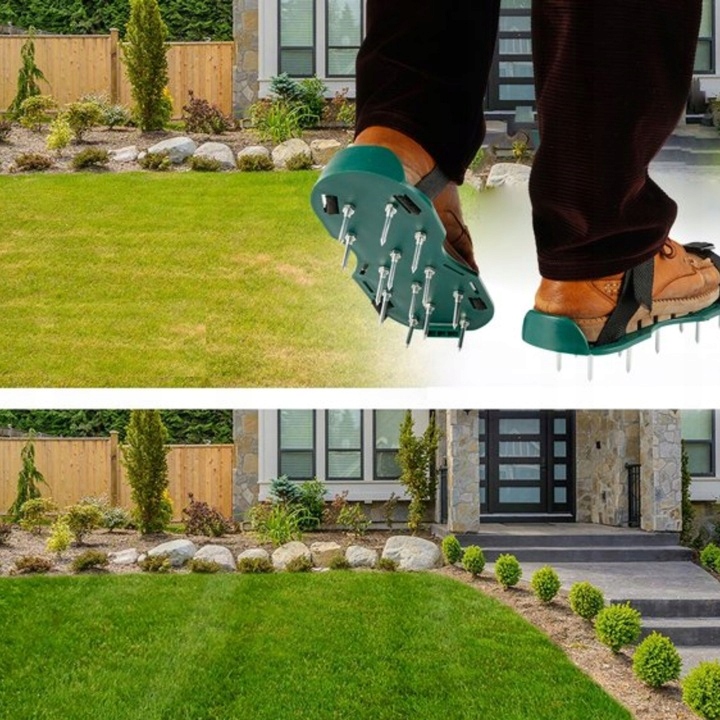 Чтобы улучшить состояние вашего газона, достаточно надеть сандаловый аэратор на обувь и отрегулировать длину лямок, а затем отправляйтесь на прогулку по газону.