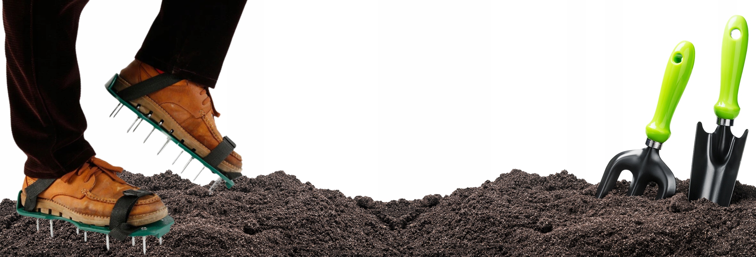 имеет форму очень удобных бахил для прокалывания и аэрации газона.