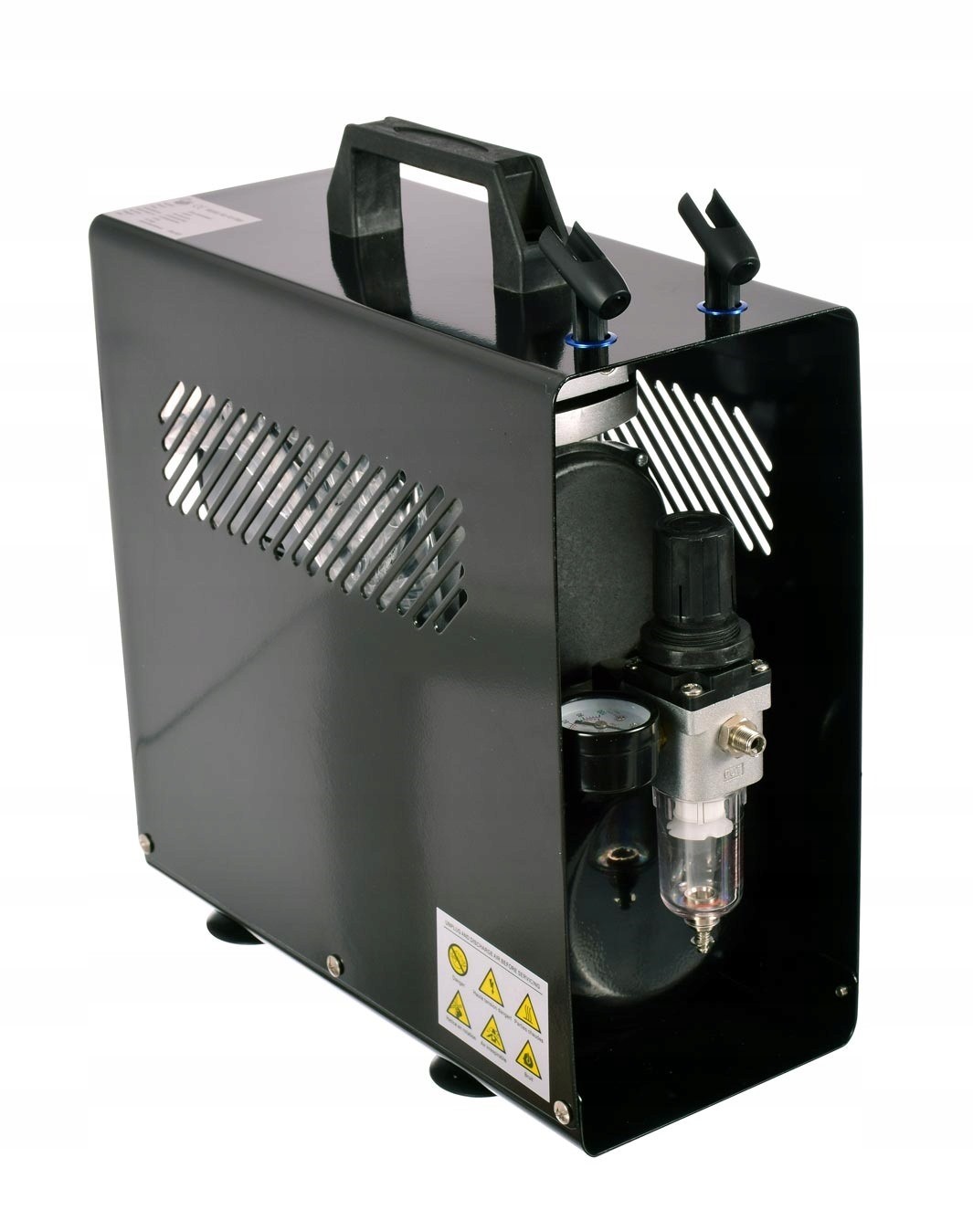 Весь компрессор окружен дополнительным металлическим кожухом, повышающим устойчивость к механическим повреждениям. Для повышения удобства работы на корпусе имеются две подставки для аэрографа.