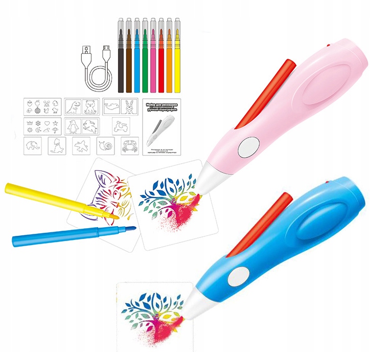 Это чрезвычайно простое в использовании устройство позволяет детям рисовать так, как они хотят, используя свое воображение и творческие способности. Благодаря разнообразию ручек и умению смешивать цвета дети могут создавать красивые изображения, узоры и украшения по собственным идеям.