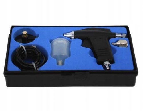 Технические параметры: - диаметр сопла 0,3 мм, - емкость бака 22 см3, - минимальное давление подачи 2,0 атм, - регулировка количества распыляемой краски.В комплект входят: краскопульт, гибкий шланг, переходник для баллона со сжатым газом, емкость с краской, дело.