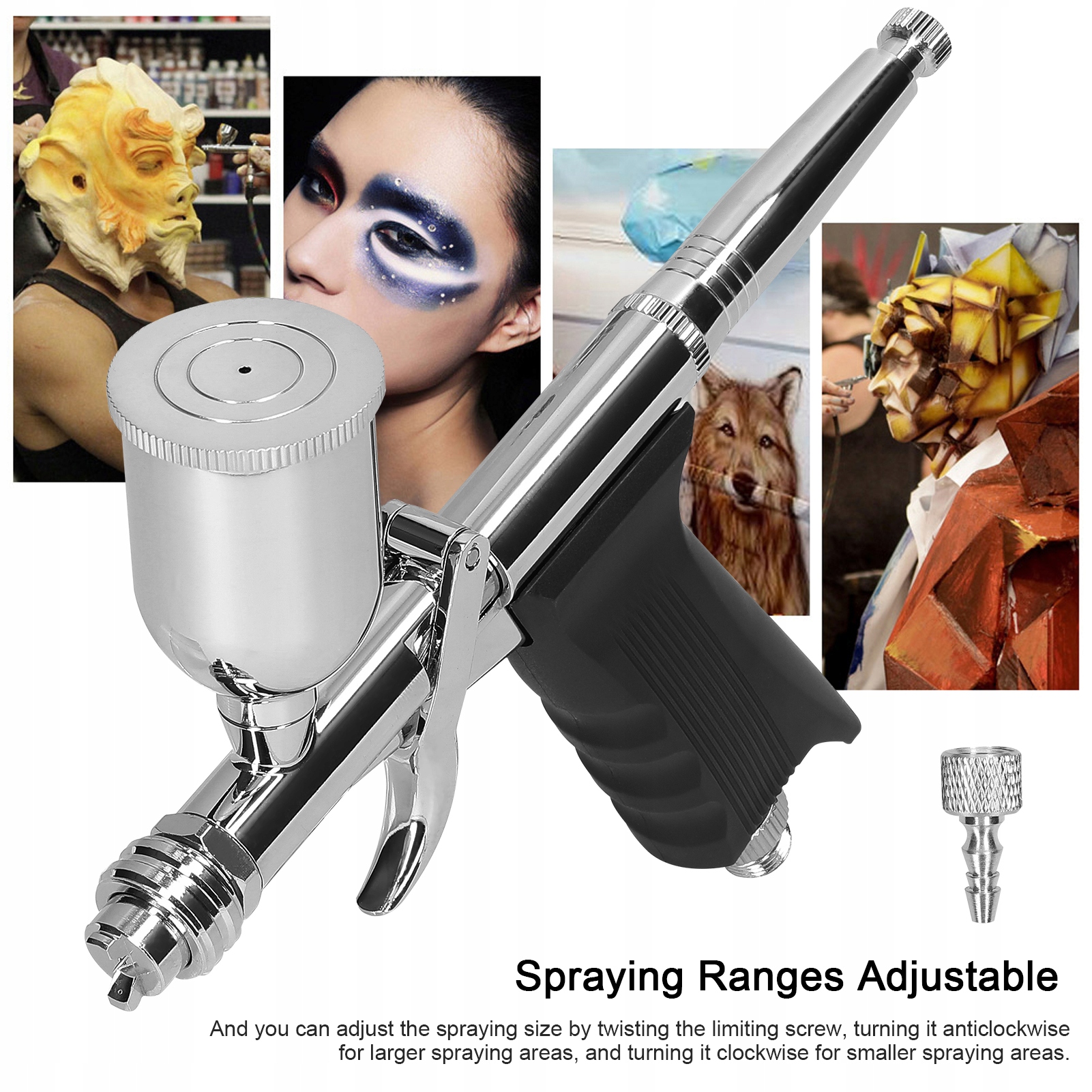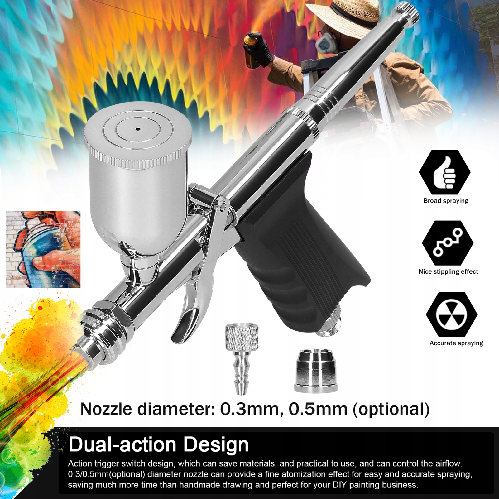 1. 【Конструкция двойного действия】: Конструкция сливного переключателя, который может сохранять материалы и практические для использования, и может управлять воздушным потоком. Сопло с диаметром 0,3/0,5 мм (необязательно) может обеспечить небольшой эффект вещания для легкого и точного распыления, экономя гораздо больше времени, чем рисунок ручной работы и идеально подходит для ее деятельности в области рисования DIY.