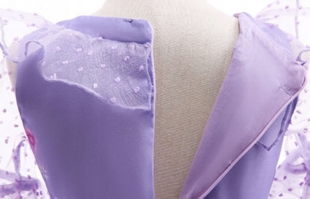 - Платье выполнено из красивых материалов в оттенках фиолетового,