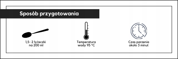 1 чайная ложка сушеной травы на чашку (200 мл), температура воды 95 градусов С, время заваривания около 3 минут. накрытым, по истечении этого времени листья следует отделить от настоя. Более длительная заварка ему также не повредит, так как он не содержит теина. Для заваривания лучше всего использовать бумажные фильтры или мелкое сито. Рекомендуемая вторая заварка, около 5 минут.