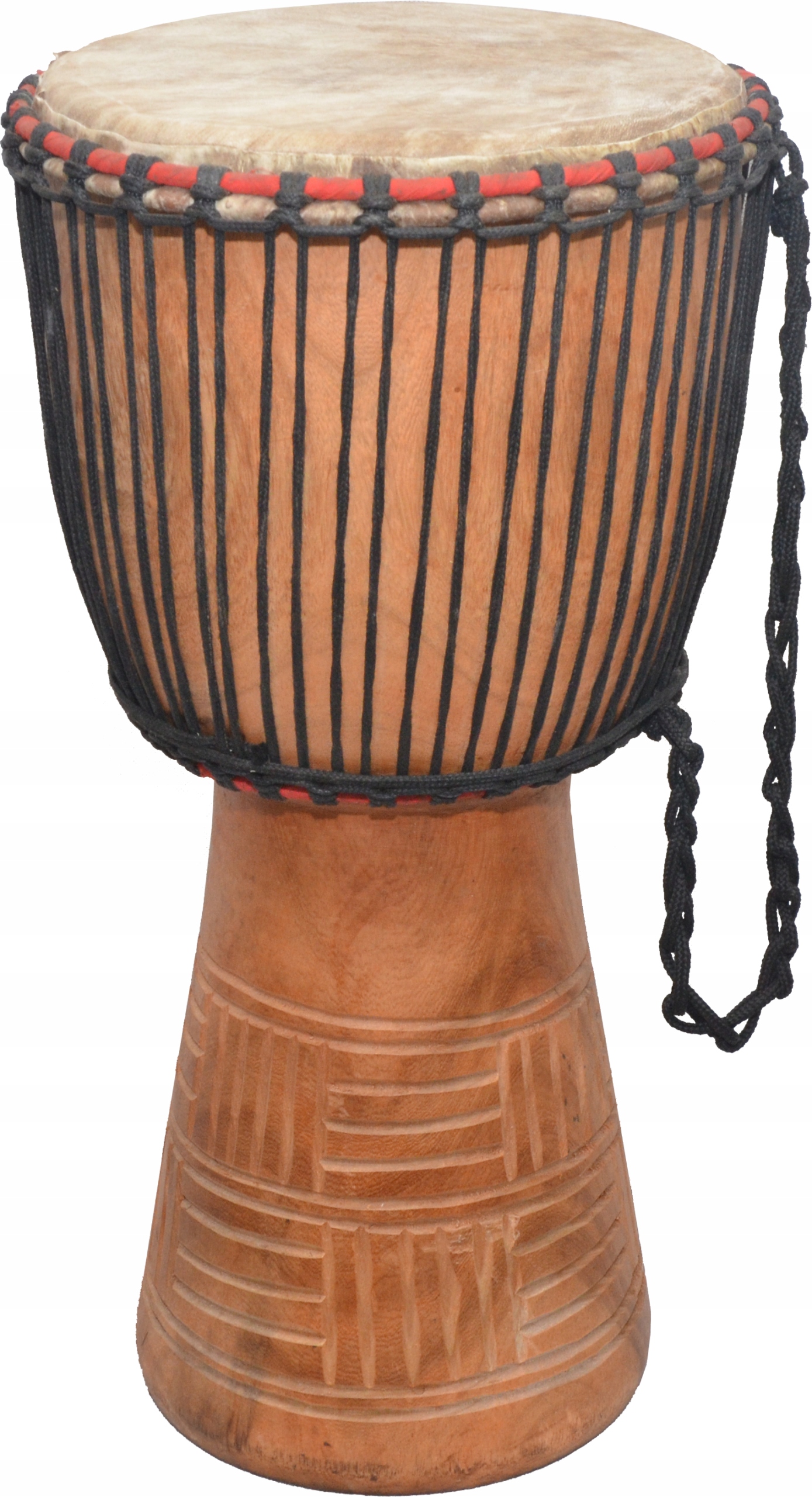 Джембе — музыкальный инструмент родом из Африки (самый популярный на западе континента), представляющий собой своеобразную чашу одномембранного барабана. Представленный инструмент представляет собой классический африканский барабан. Инструмент изготовлен в Гане из цельного куска дерева Мансония. Мембрана натуральная, получена от африканской козы. Веревка крепится традиционным способом, т.е. с помощью завязок. В связи с тем, что инструмент изготовлен вручную, канавки могут отличаться от показанных на фотографии.